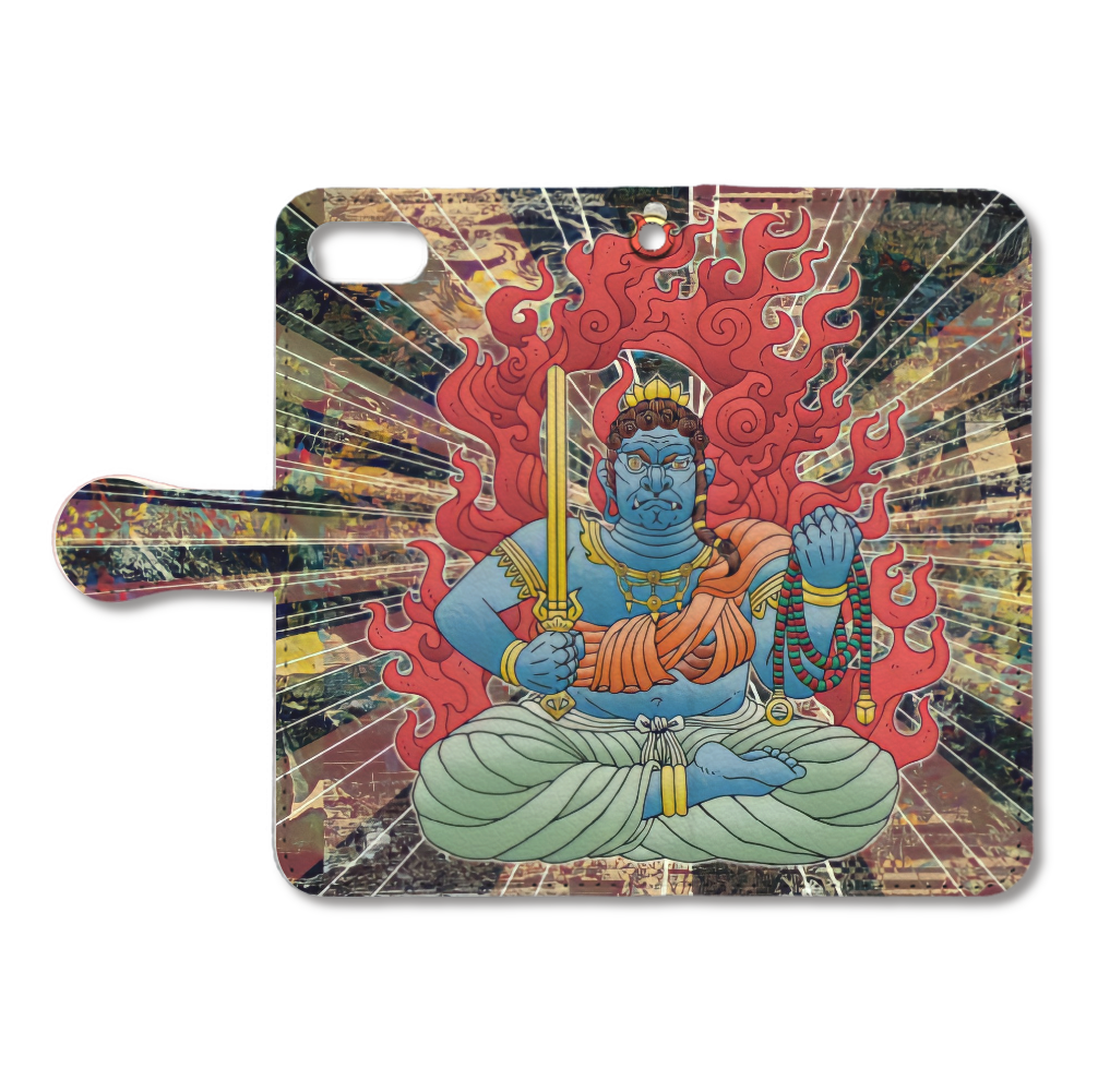 下水丸アルバム「仏の顔も三度まで」不動明王をあしらった手帳型スマホケースです(iphoneSE2)。アーティストの永石浩幸氏、河童モルヒネ氏、juntoki氏達によるアートワークジャケットより