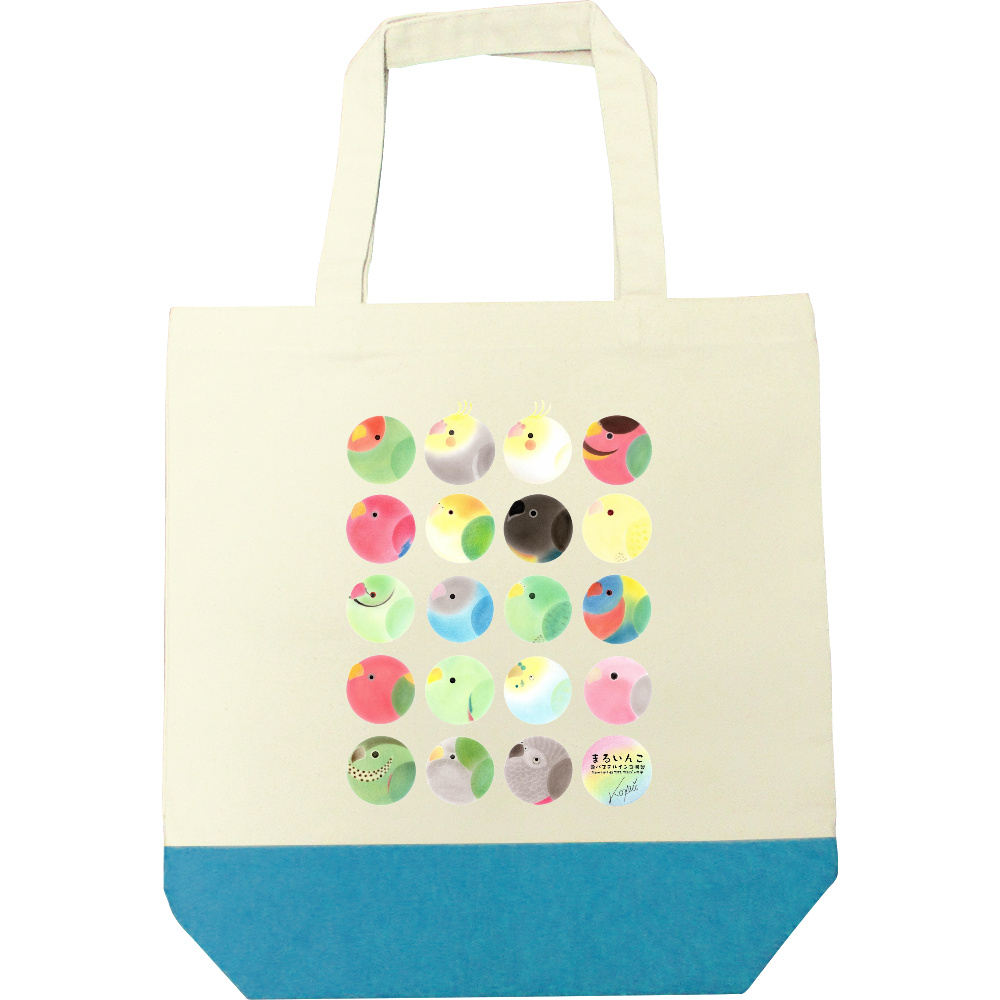 まるいんこシリーズ第1弾のインコたちが一堂に会し、菓子折りのようにきれいに並んでツートンカラーのトートバッグになりました。