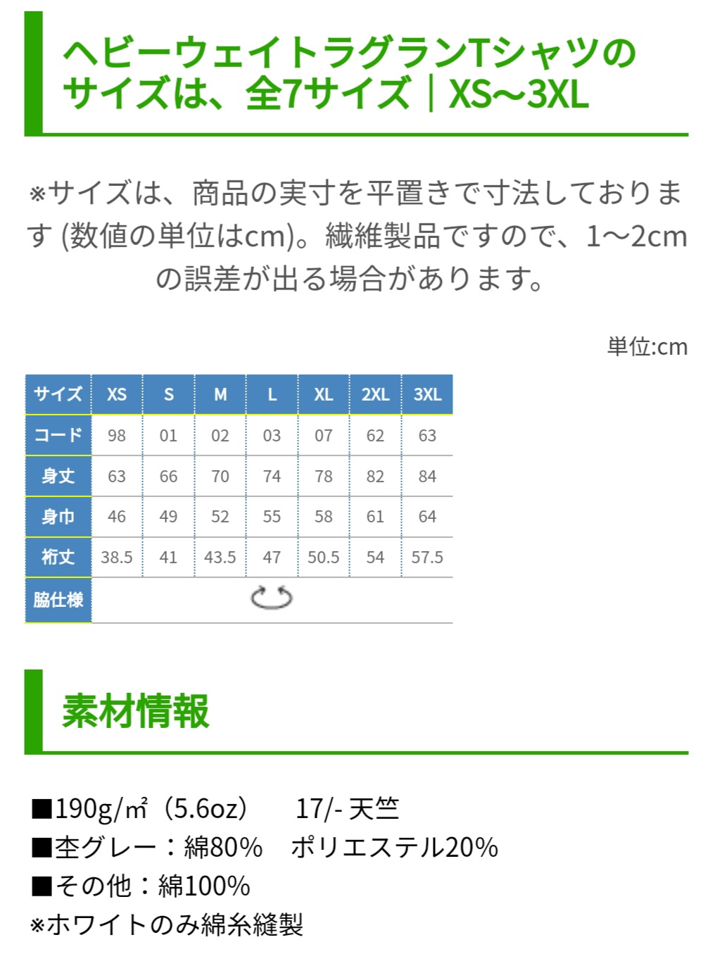 | 脇仕様 | 丸胴(脇腹にプリント可能) | ||||||