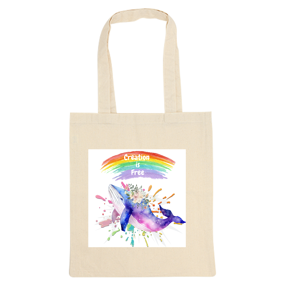 クジラは慈愛、創造のパワー、とても大きなエネルギーがあるといわれています。そんなくじらが大きなキャンパスでにじを描く姿をデザインしました。ものごとの想像は自由であるというメッセージを込めて作りました。