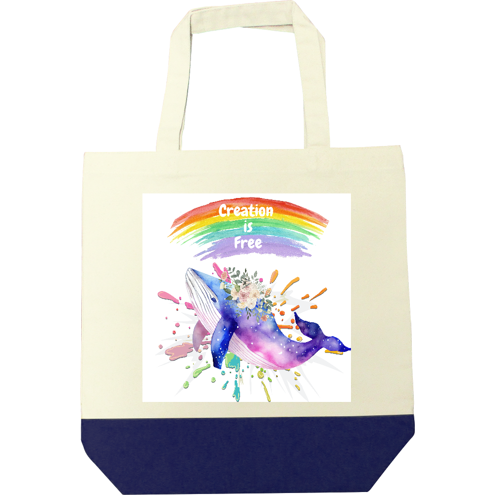 クジラは慈愛、創造のパワー、とても大きなエネルギーがあるといわれています。そんなくじらが大きなキャンパスでにじを描く姿をデザインしました。ものごとの想像は自由であるというメッセージを込めて作りました。