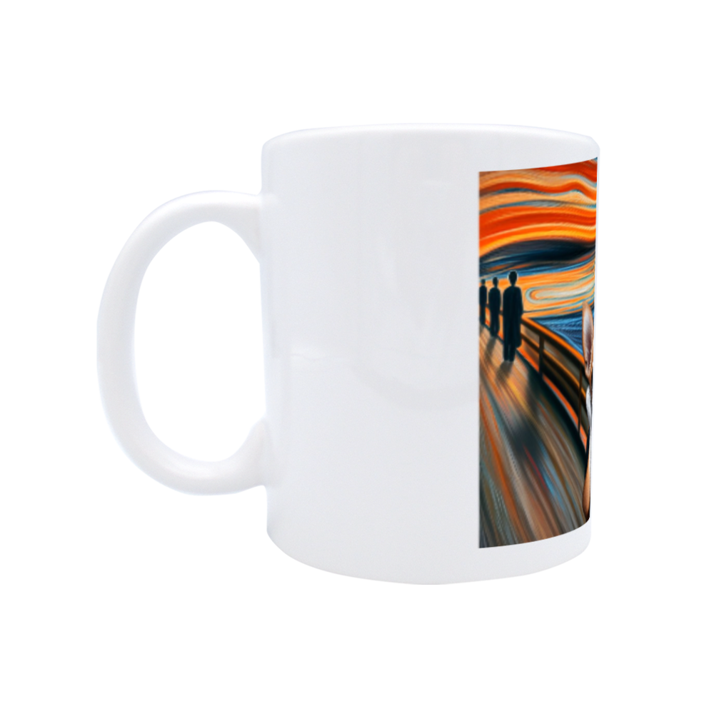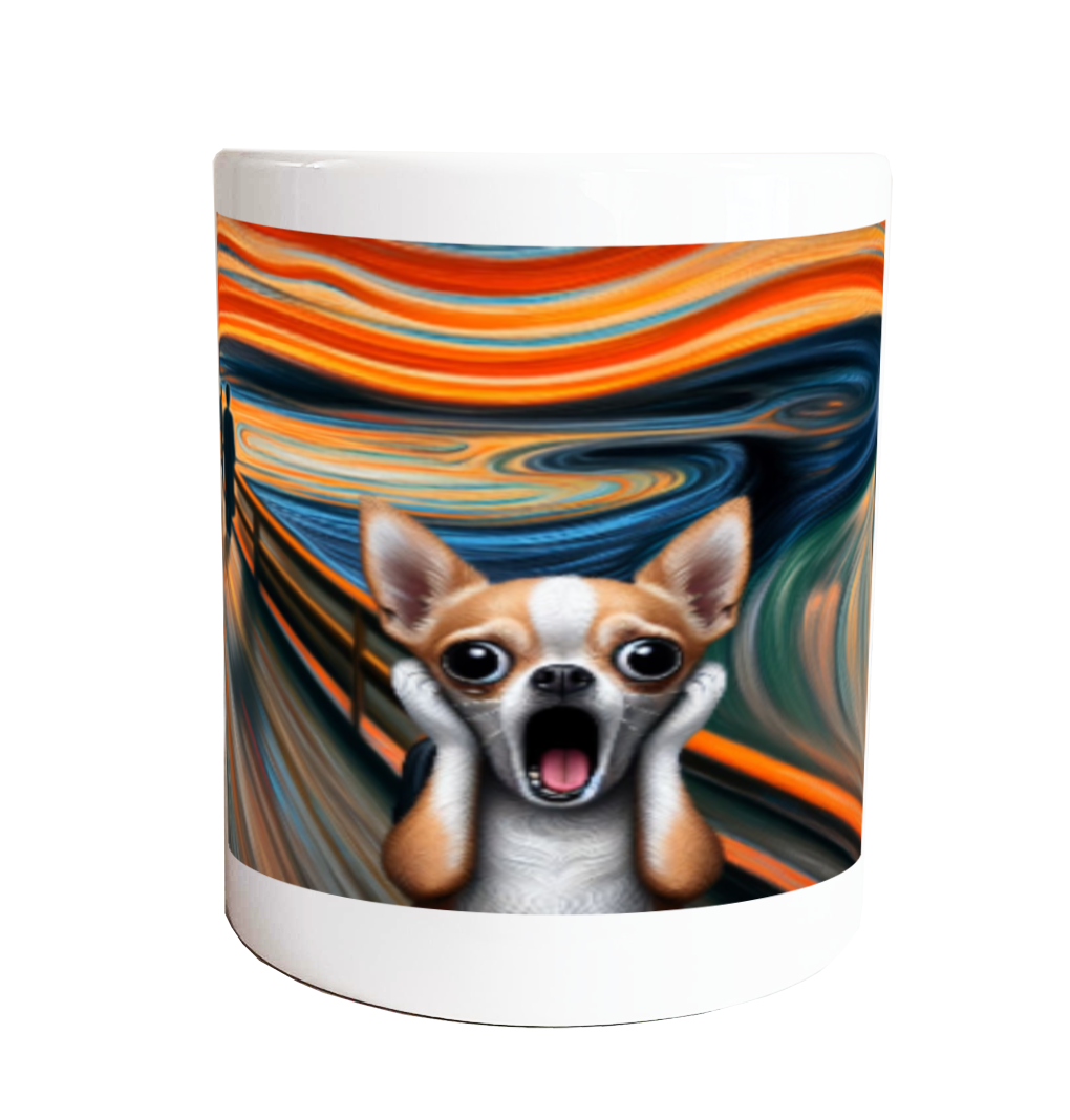【アートと愛らしさの融合】チワワ×ムンク マグカップ このマグカップは、エドヴァルド・ムンクの象徴的な作品「叫び」と小さくて愛らしいチワワを組み合わせた、ユニークなアート作品です。深みのある色彩と表情豊かなチワワが、あなたの日常に新たな彩りをもたらします。飲み物を楽しむたびに、芸術とペットの温もりを感じることができます。このマグカップで、朝のコーヒータイムをもっと特別なものにしましょう。