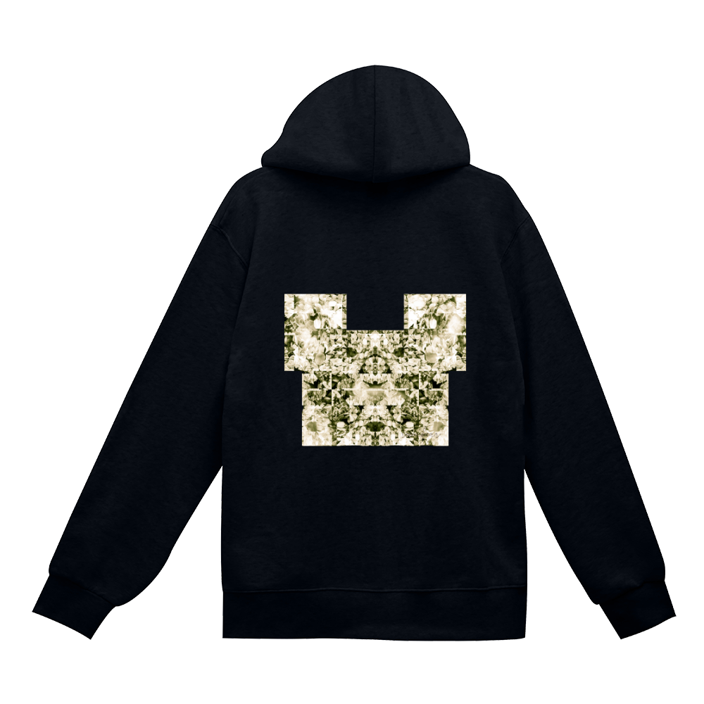 デザインを作成する時のテンプレートでは、フードの位置が邪魔にならないよう上の方にコンパクトに描かれておりますが、実際はもっと低い位置に大きくフードが垂れ下がります。