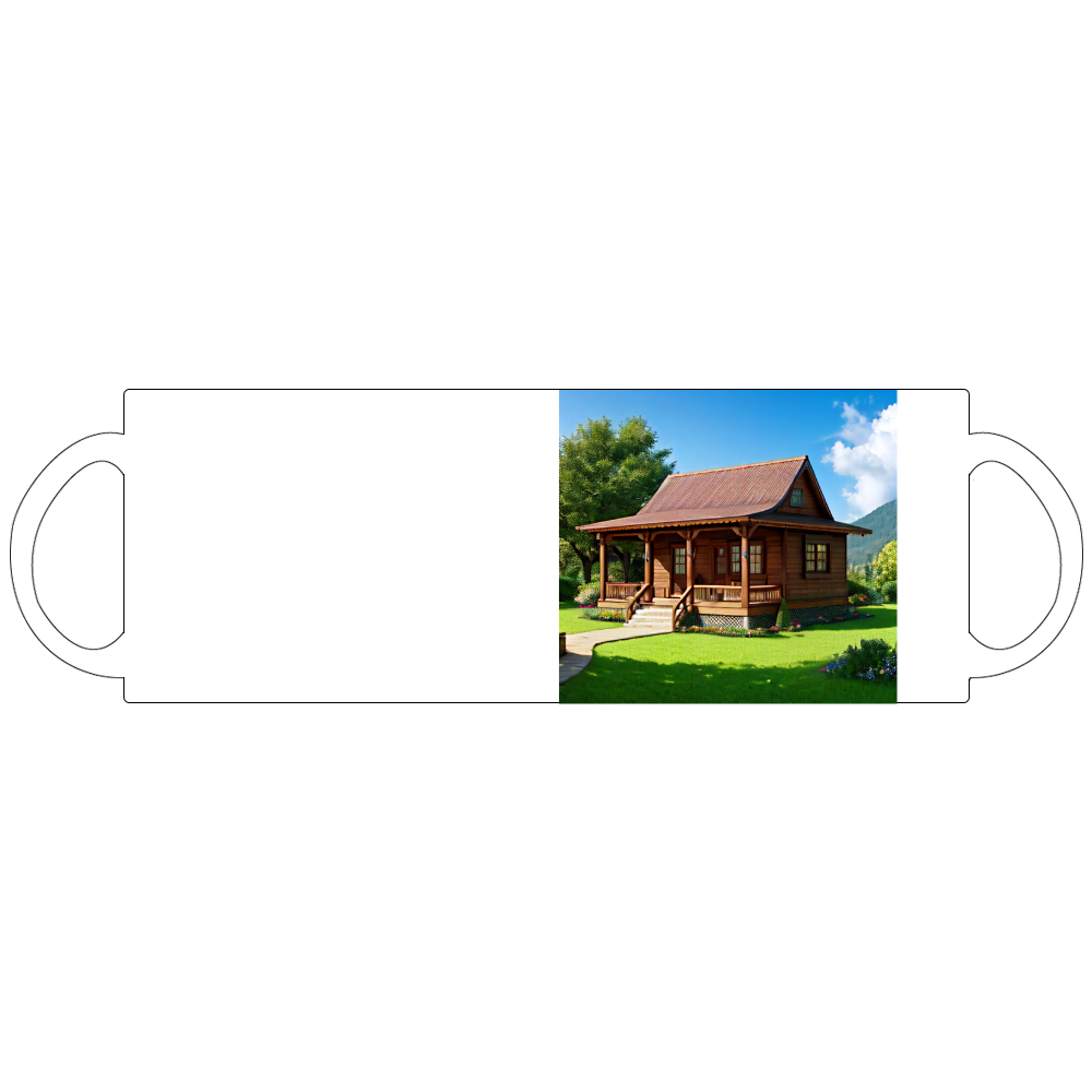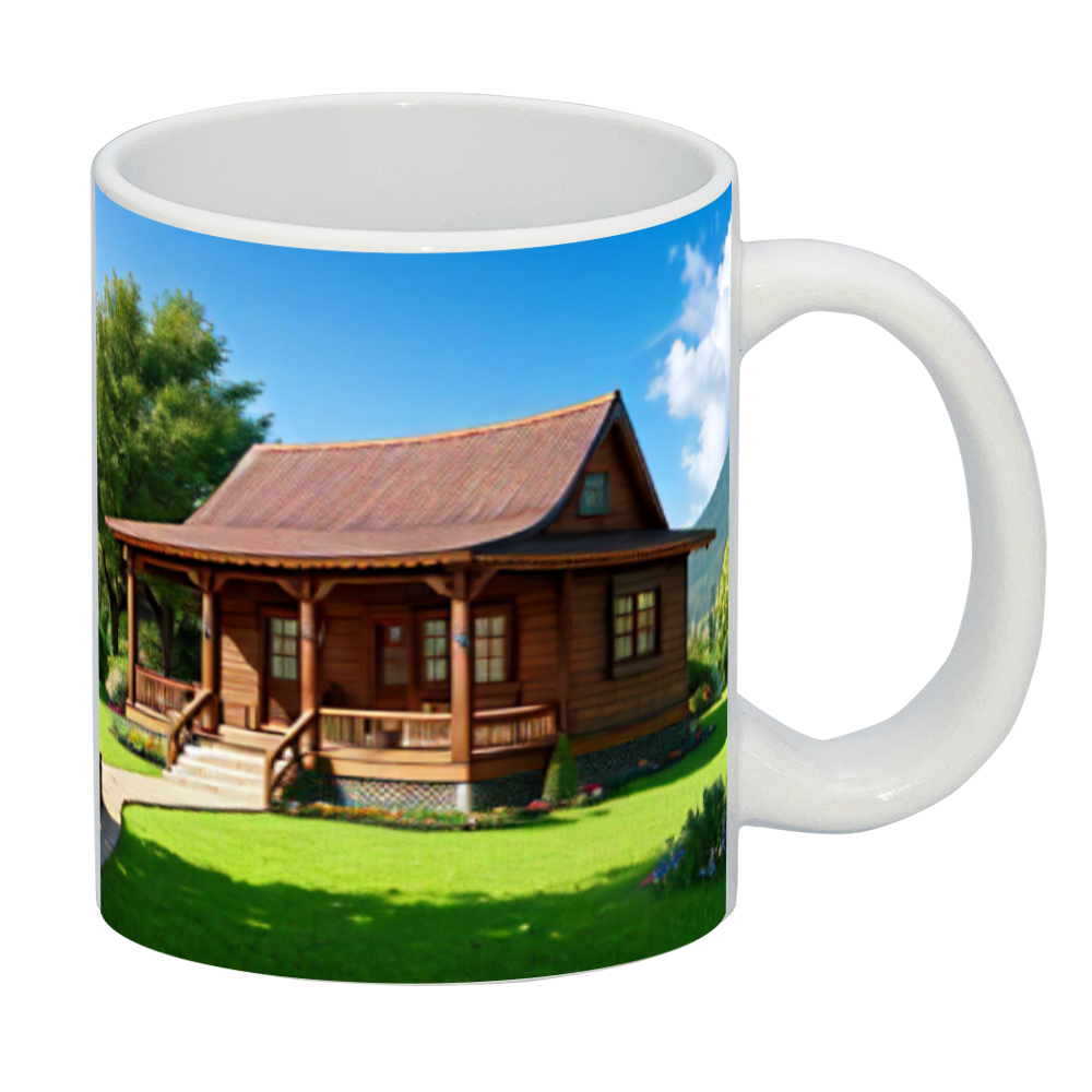 ・オリジナルデザイン:自然豊かな小屋のイラストをあしらった、心温まるデザインのマグカップ。アウトドアや田舎の風景を感じさせる癒しの一品です。