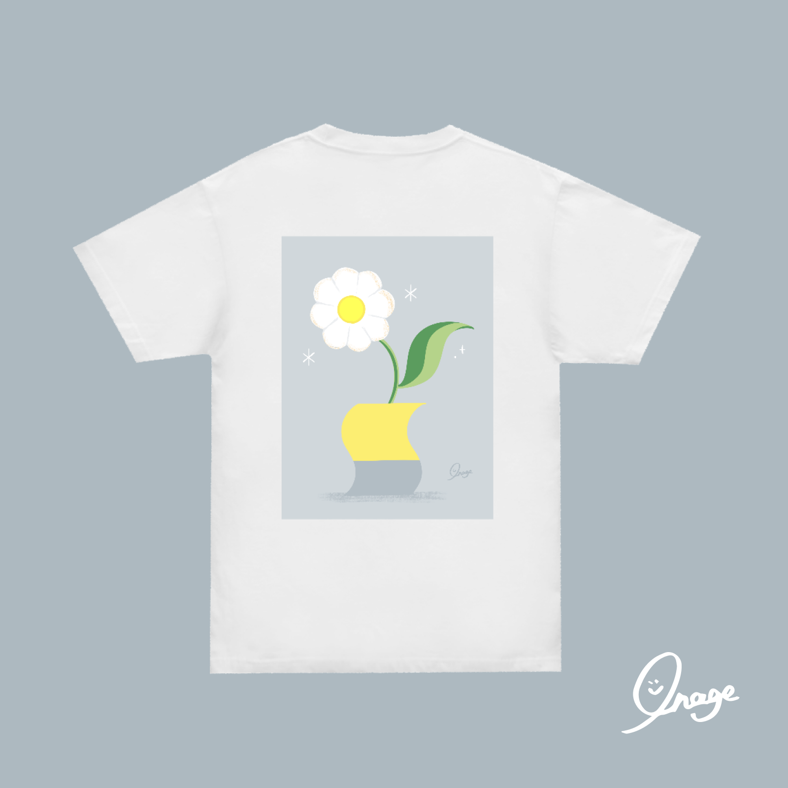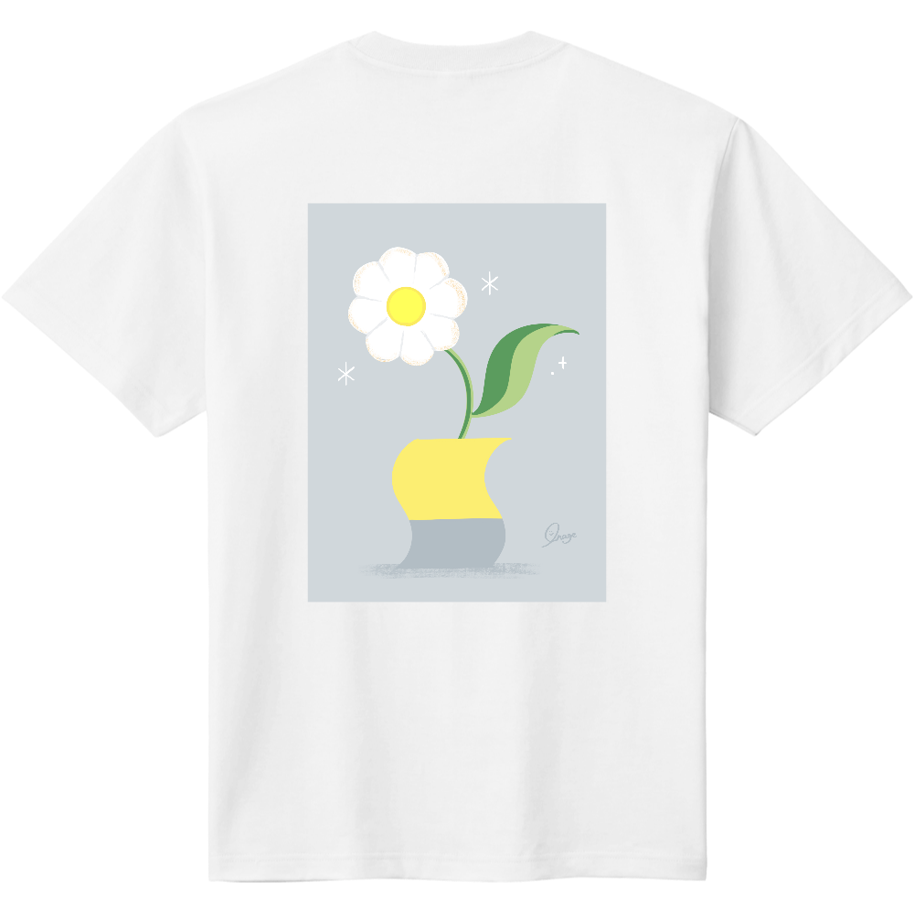 白Tシャツに裏にベースがグレーのイラストでお花がSLOWの『S』を表しています。