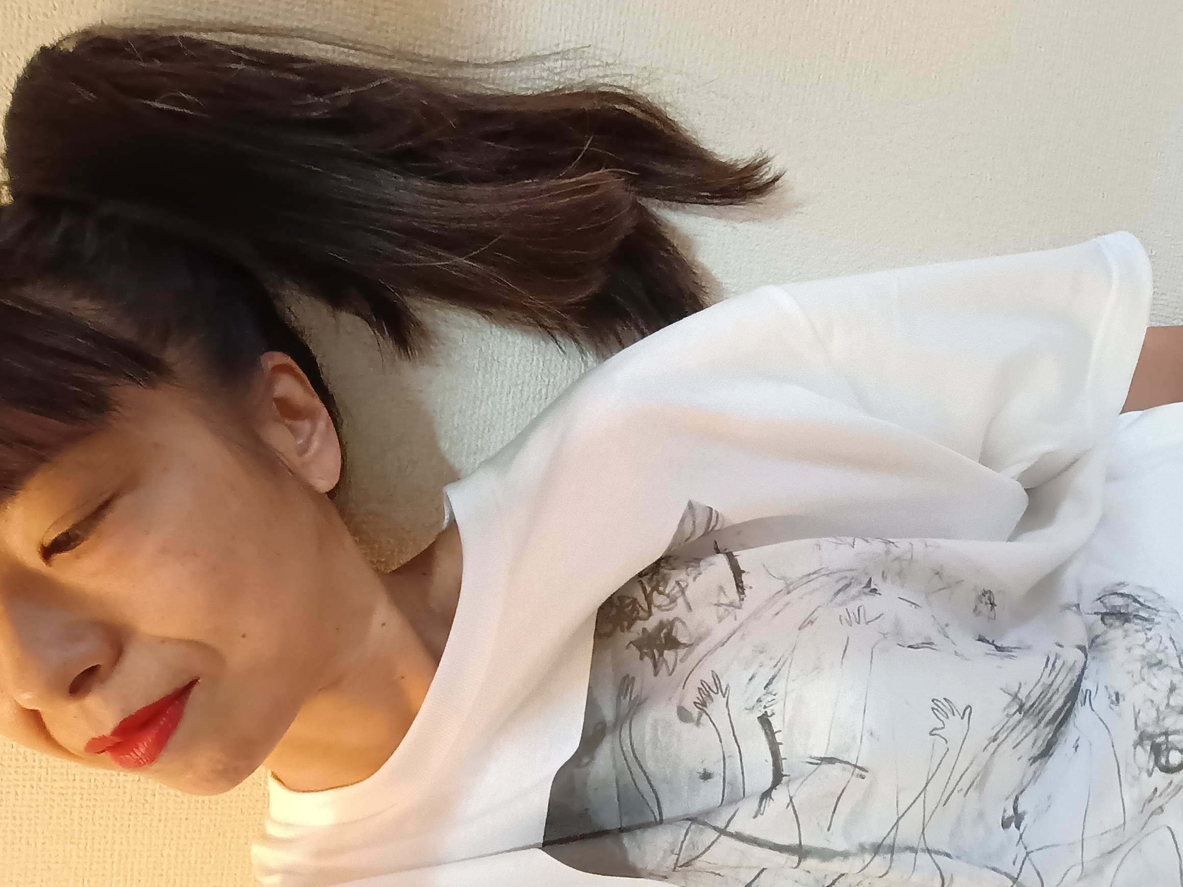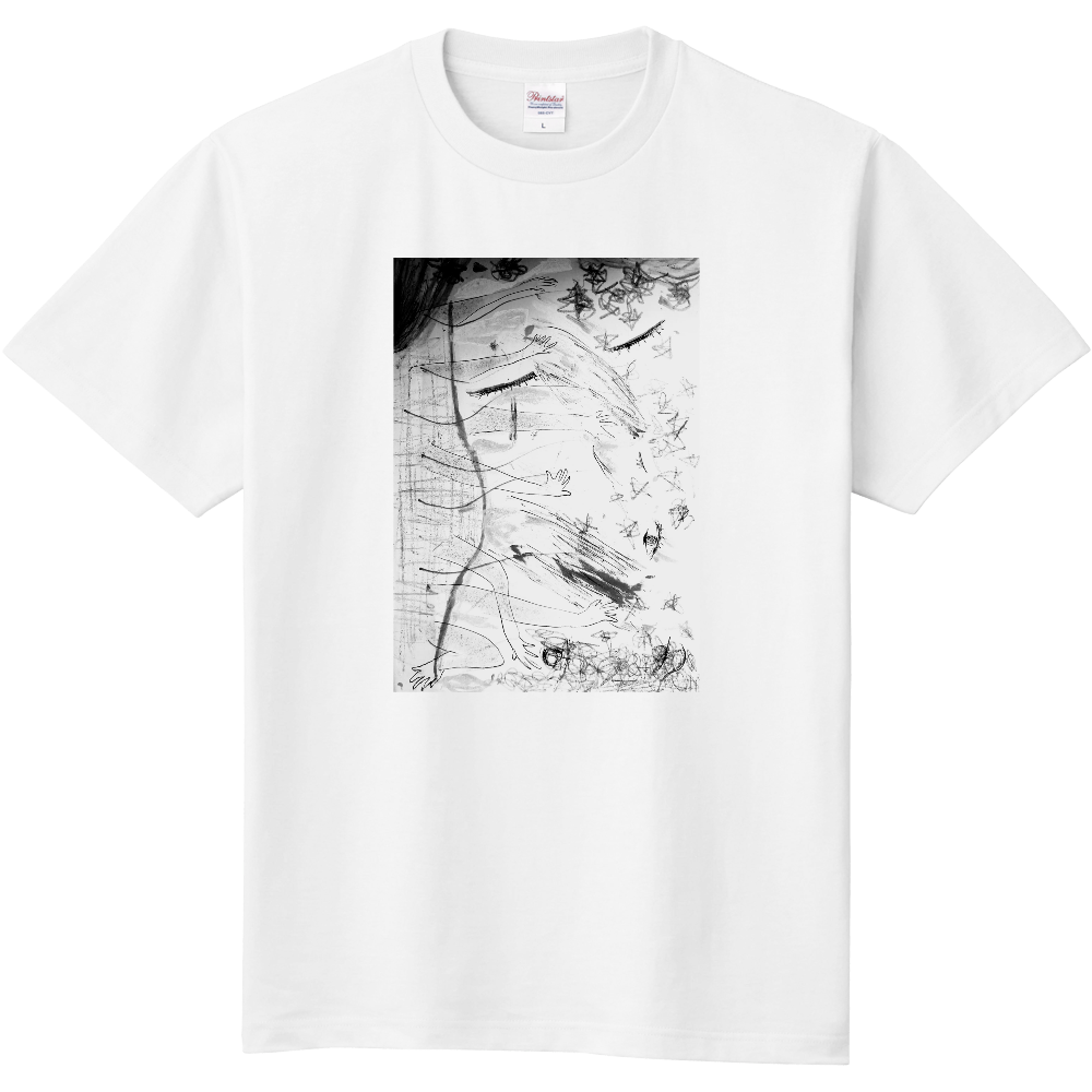 使用絵画は千鶴子の「愛の視点」。原画はカラーですが、赤とのコントラストをイメージしてこのTシャツのはモノクロにしてみました。