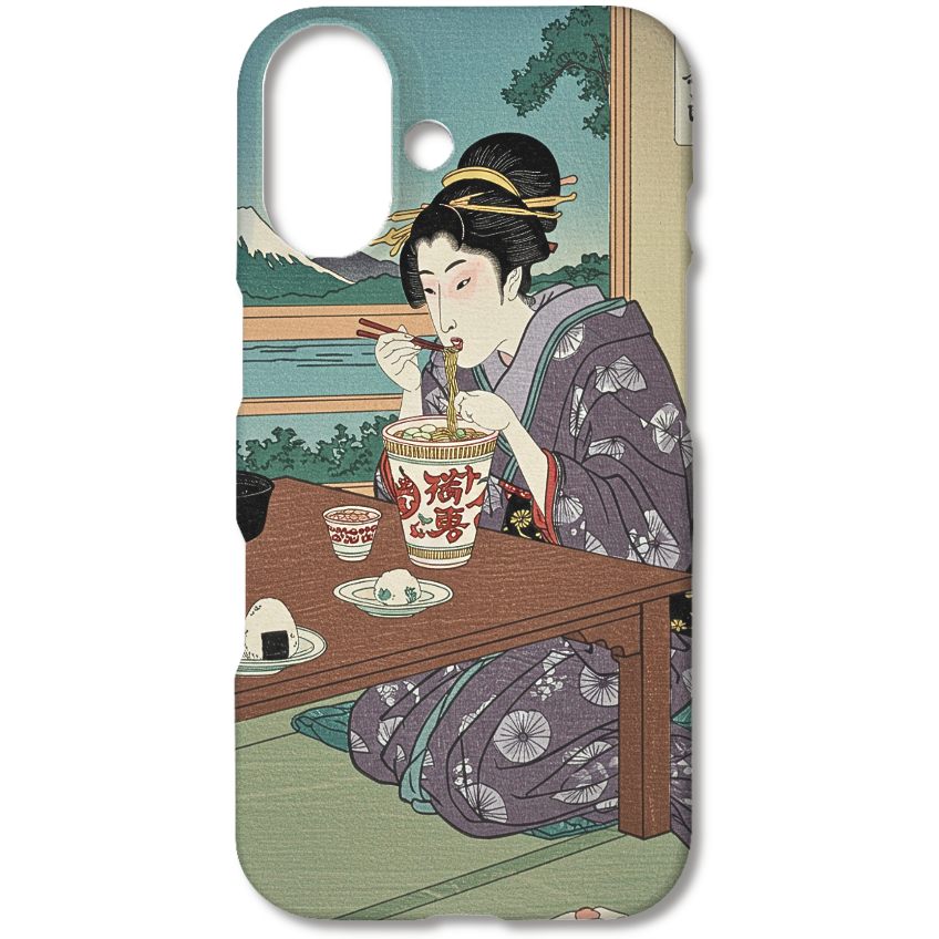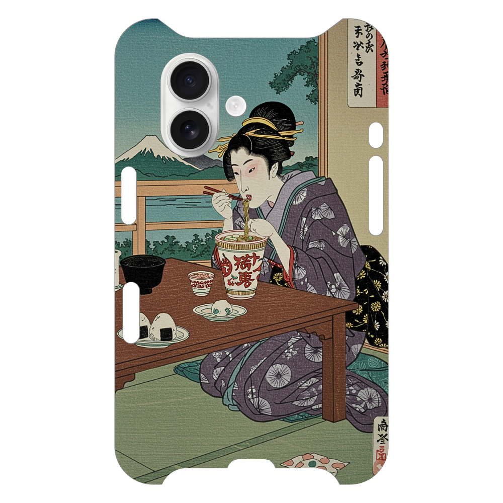 艶やかな浮世絵の遊女が、手にしているのは――まさかのカップヌードル!江戸の雅と令和のB級グルメが、スマホの背面で奇跡の出会い!毎日手にするスマホだからこそ、ちょっとした話題作りと個性アピールを一緒に!ケースを持つあなたも、まさに時代をまたぐスタイルの持ち主に!