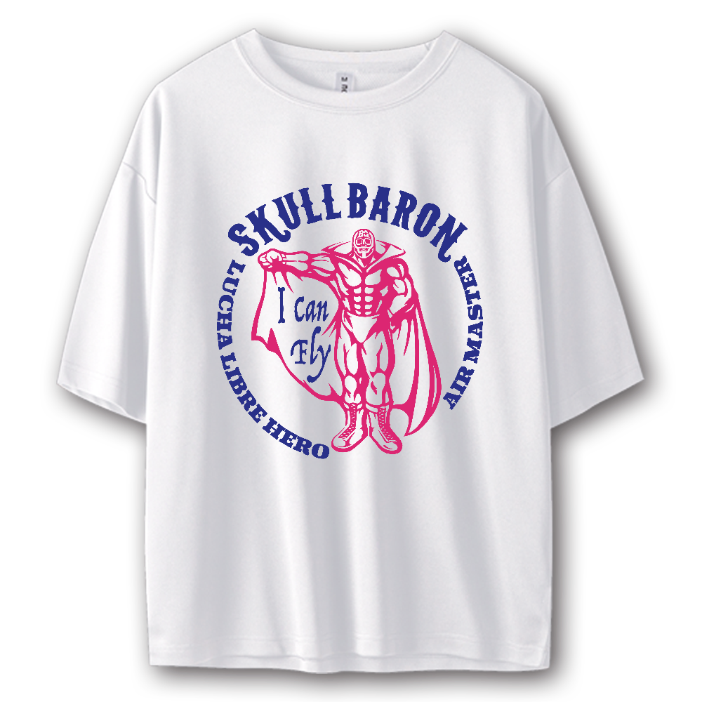 昭和のプロレスで空中殺法で活躍していそうな架空のメキシコ人マスクマン「髑髏男爵(スカルバロン)」をデザインし薄いカラーの生地に合うよう構成しました。
