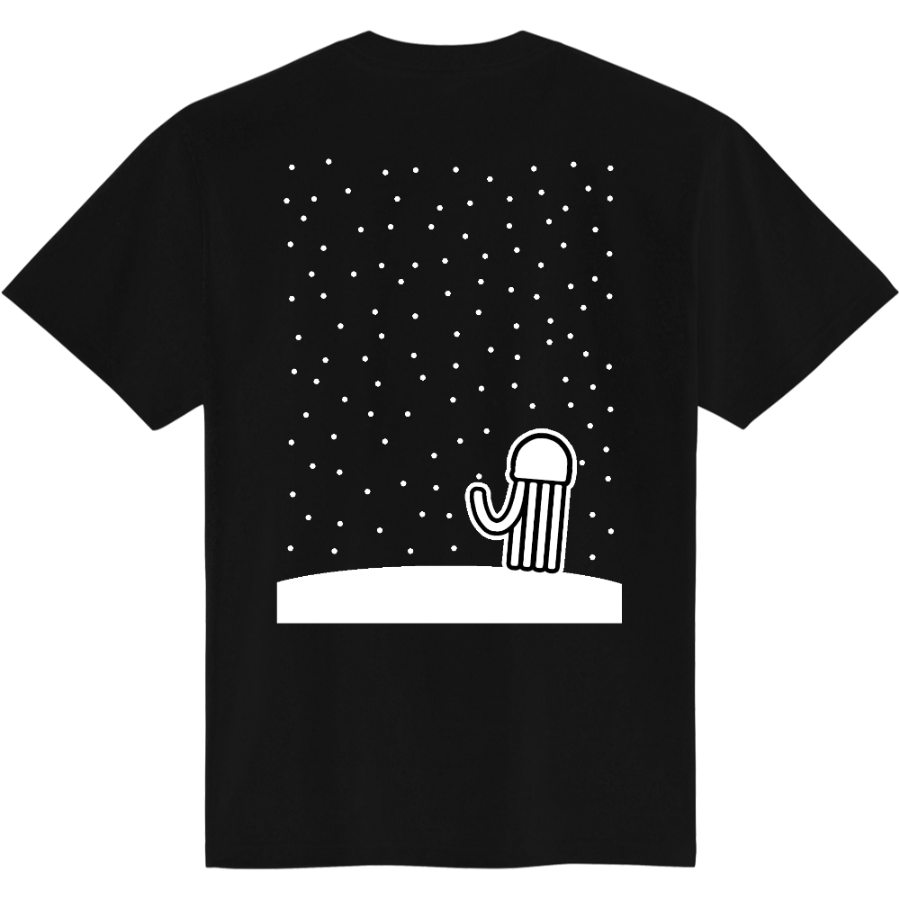 宇宙人が地球征服のため旅立った後、一人母星に残ったクラゲもどきが空(宇宙空間)から降る無数の星を見つめる様子をTシャツにしました。
