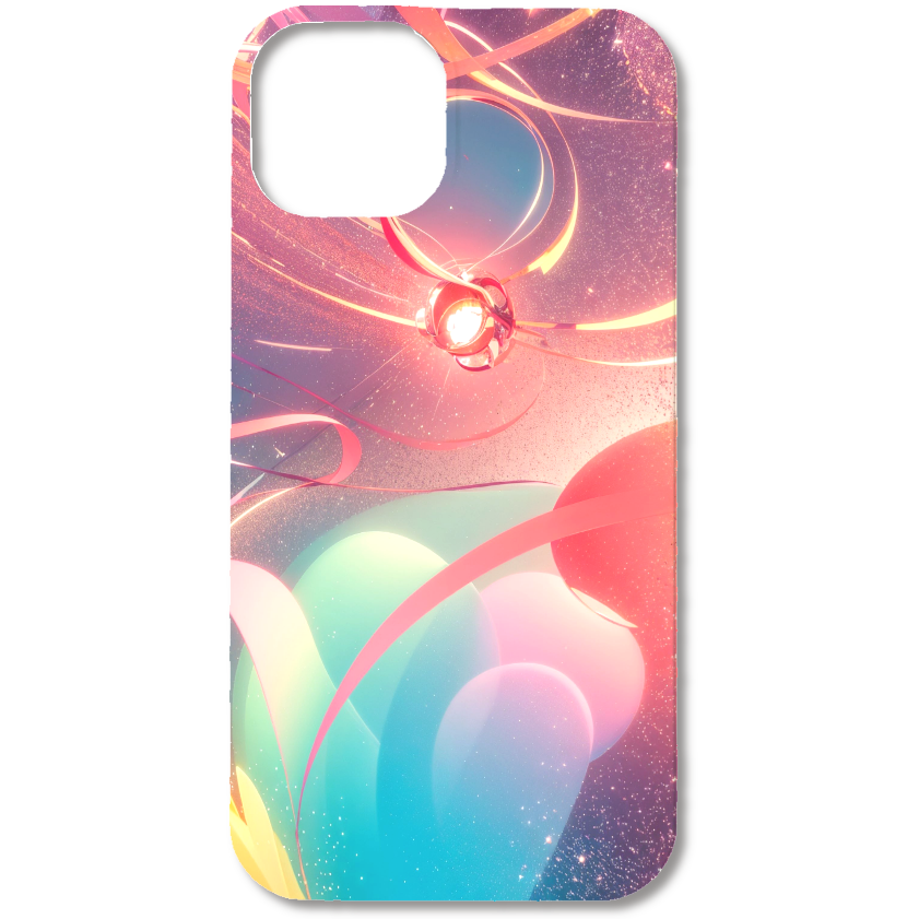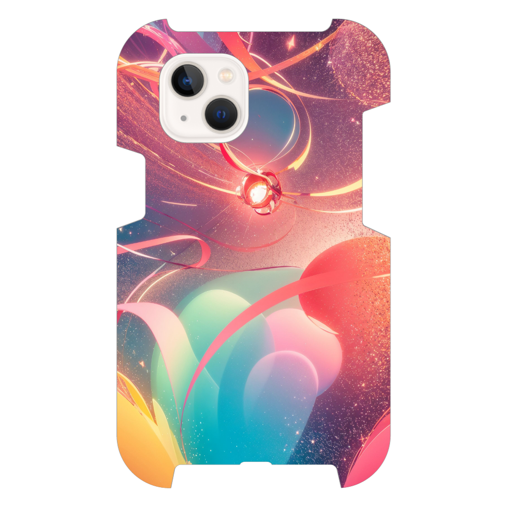 無重力空間に、光の帯が優雅に舞い、宝石のような球体が浮かぶ、SF映画のワンシーンのようなスマホケースです。
