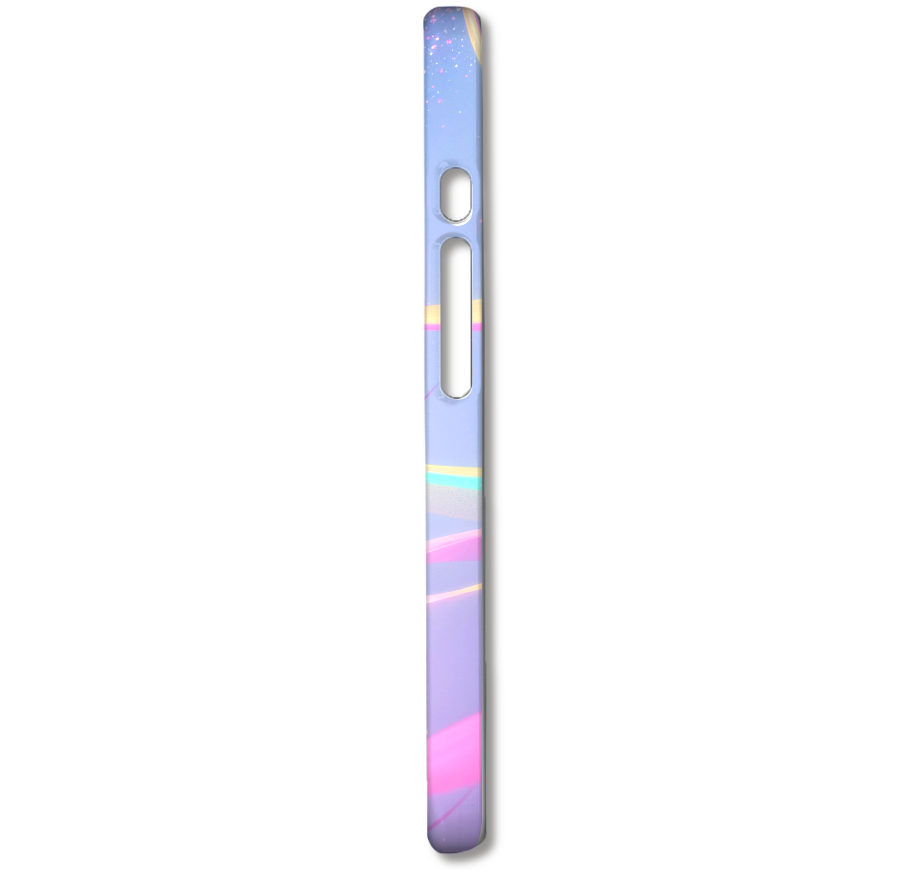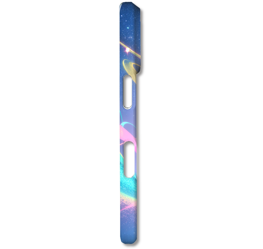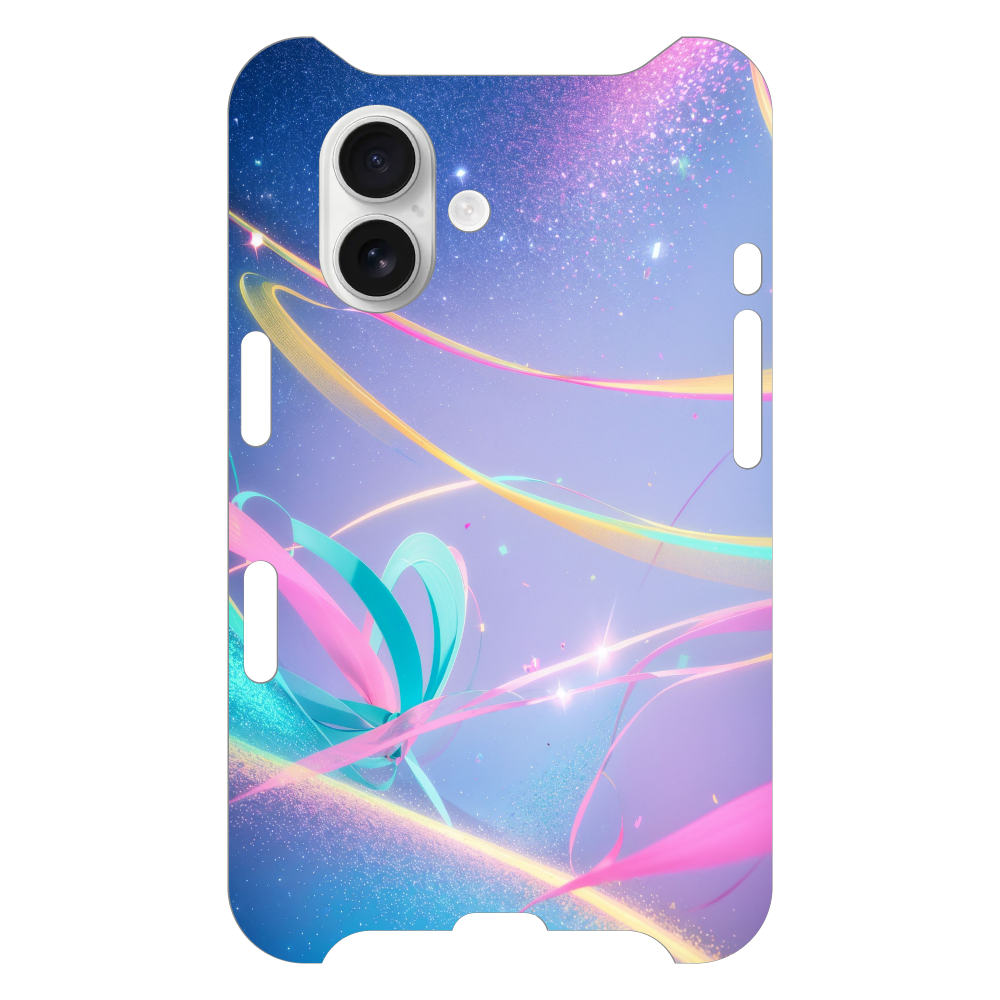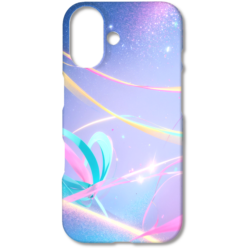 深く澄んだ夜空に、流れるようなカラフルなリボンが舞い踊る、幻想的なデザインのスマホケースです。