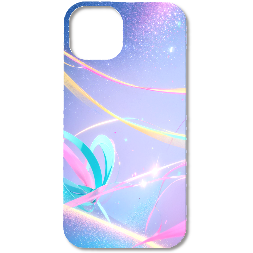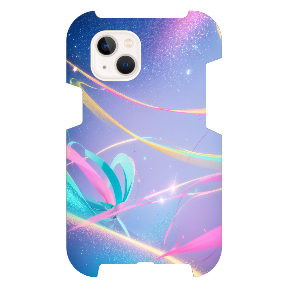深く澄んだ夜空に、流れるようなカラフルなリボンが舞い踊る、幻想的なデザインのスマホケースです。