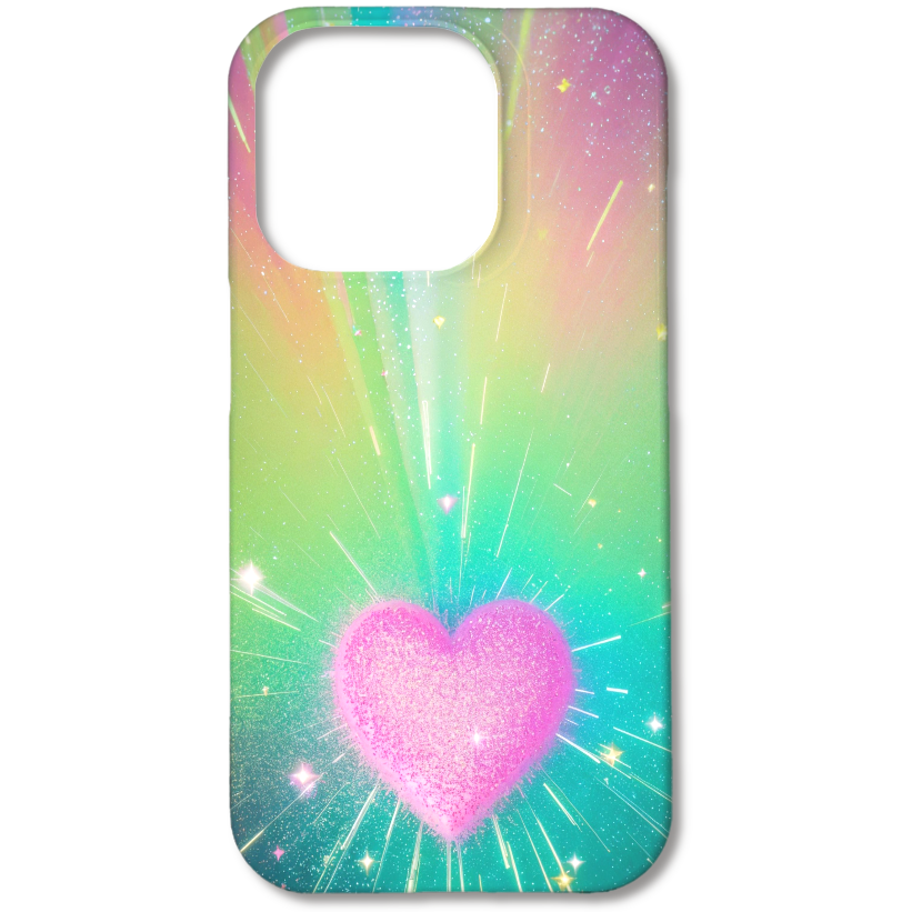 虹色にきらめくグリッターの道が、夢の世界へと誘うような幻想的なデザインのスマホケースです。