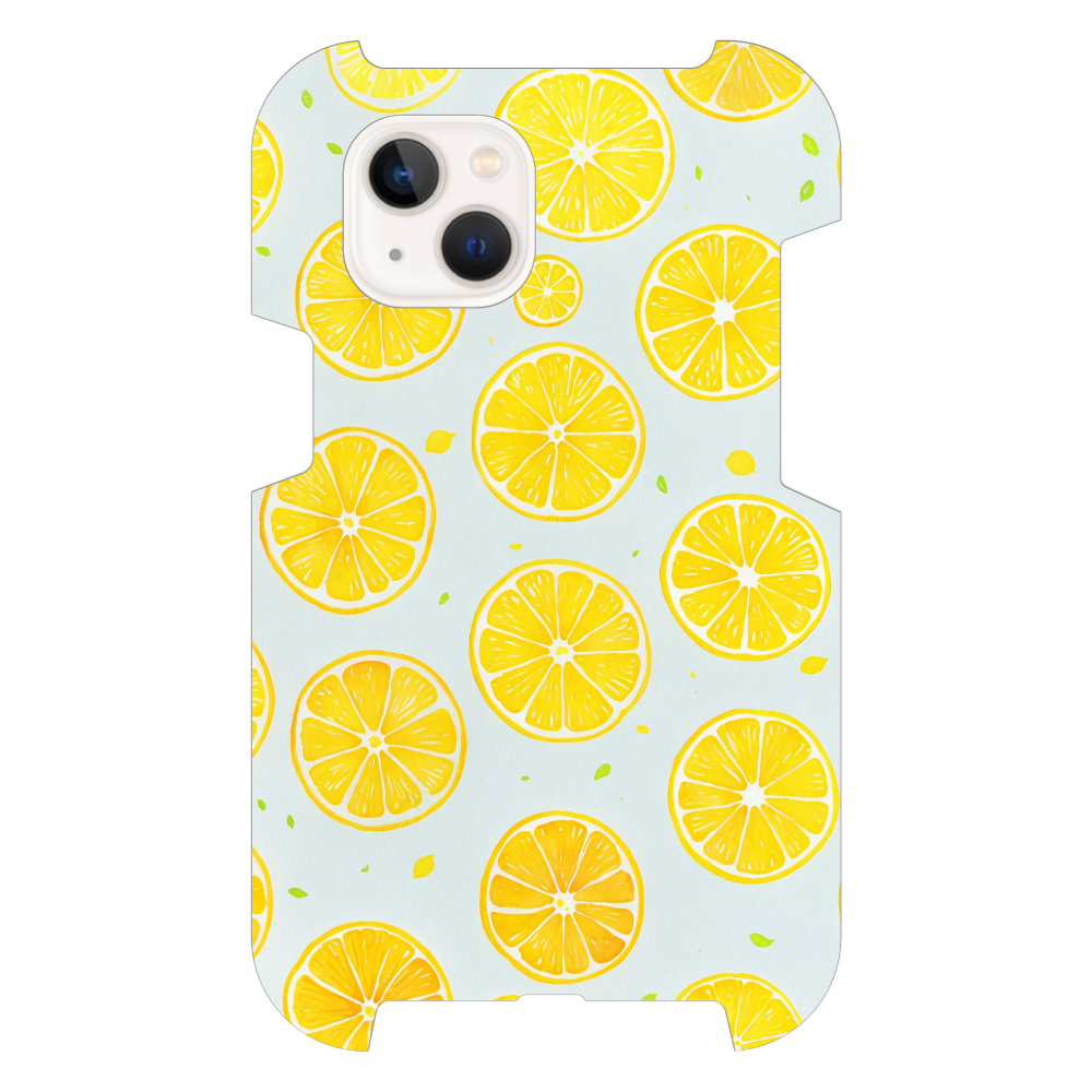 太陽の光をたっぷり浴びたレモンの輪切りが、軽やかに舞い降りるような、爽やかなスマホケースです。