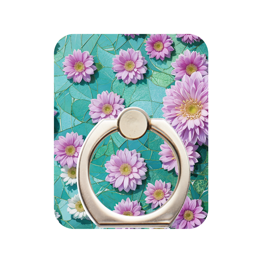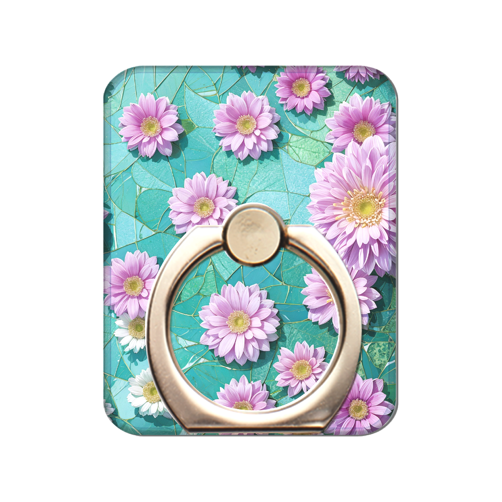 華やかなピンクのガーベラが、エメラルドグリーンのモザイクタイルの上に咲き誇る、美しいデザインのスマホケースです。