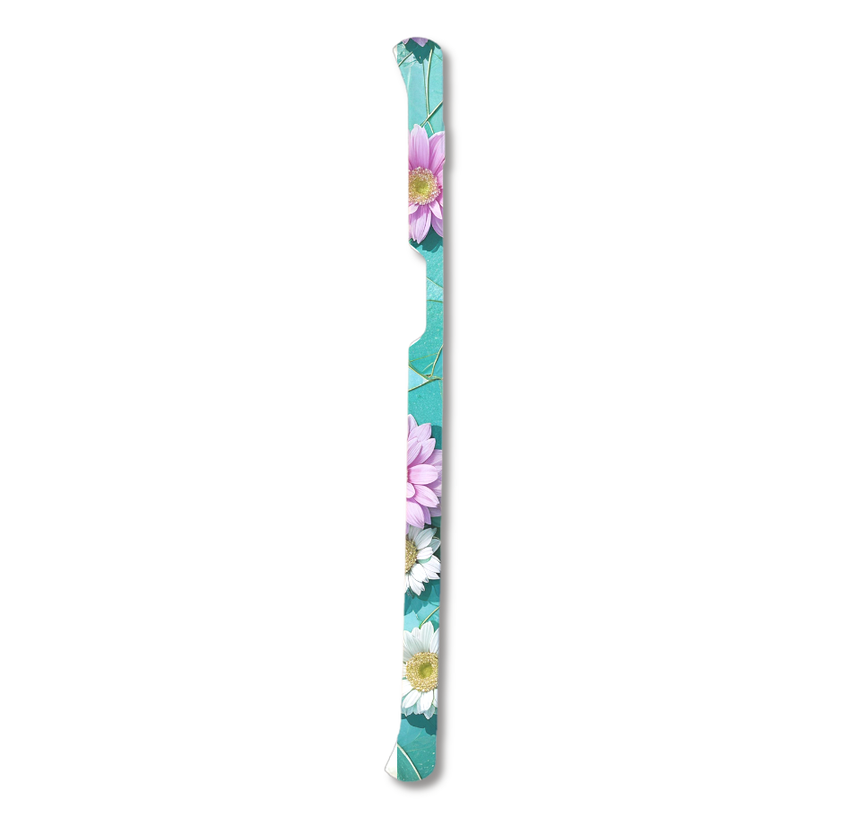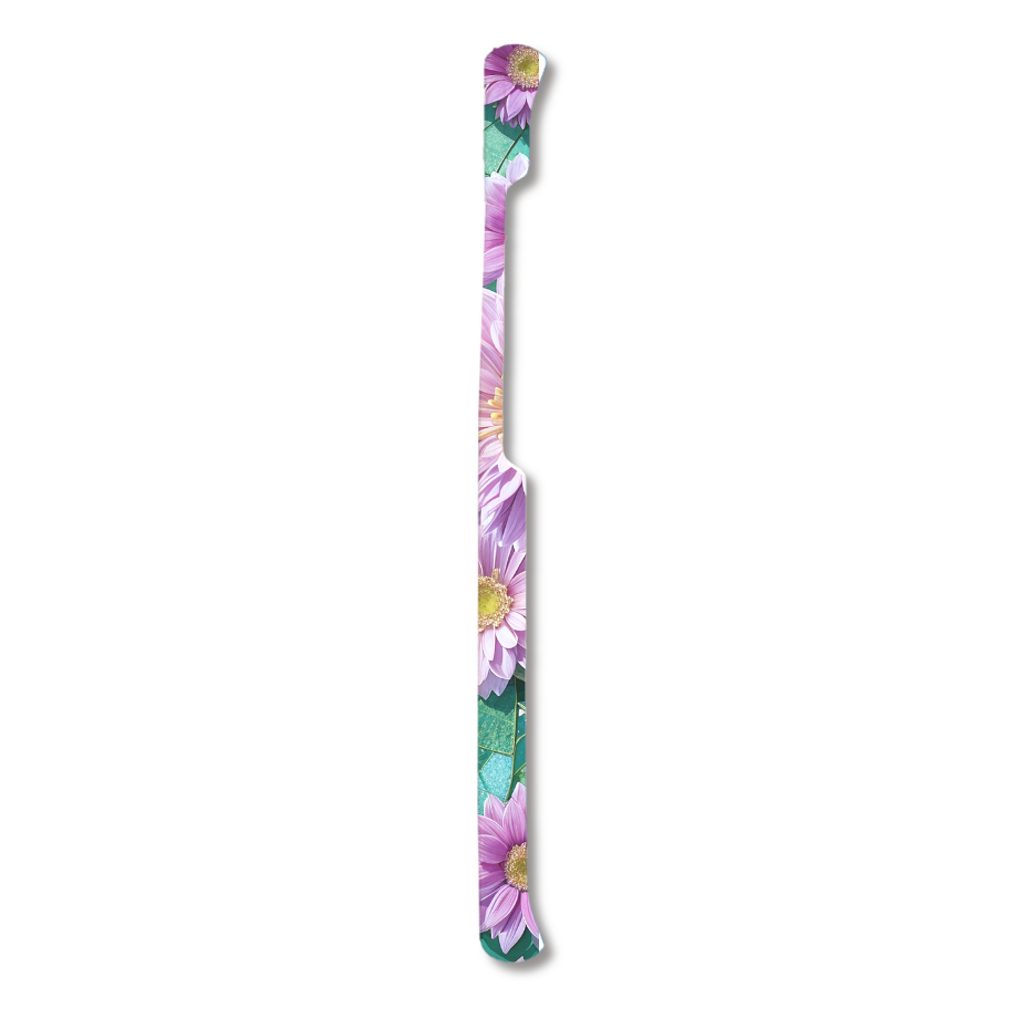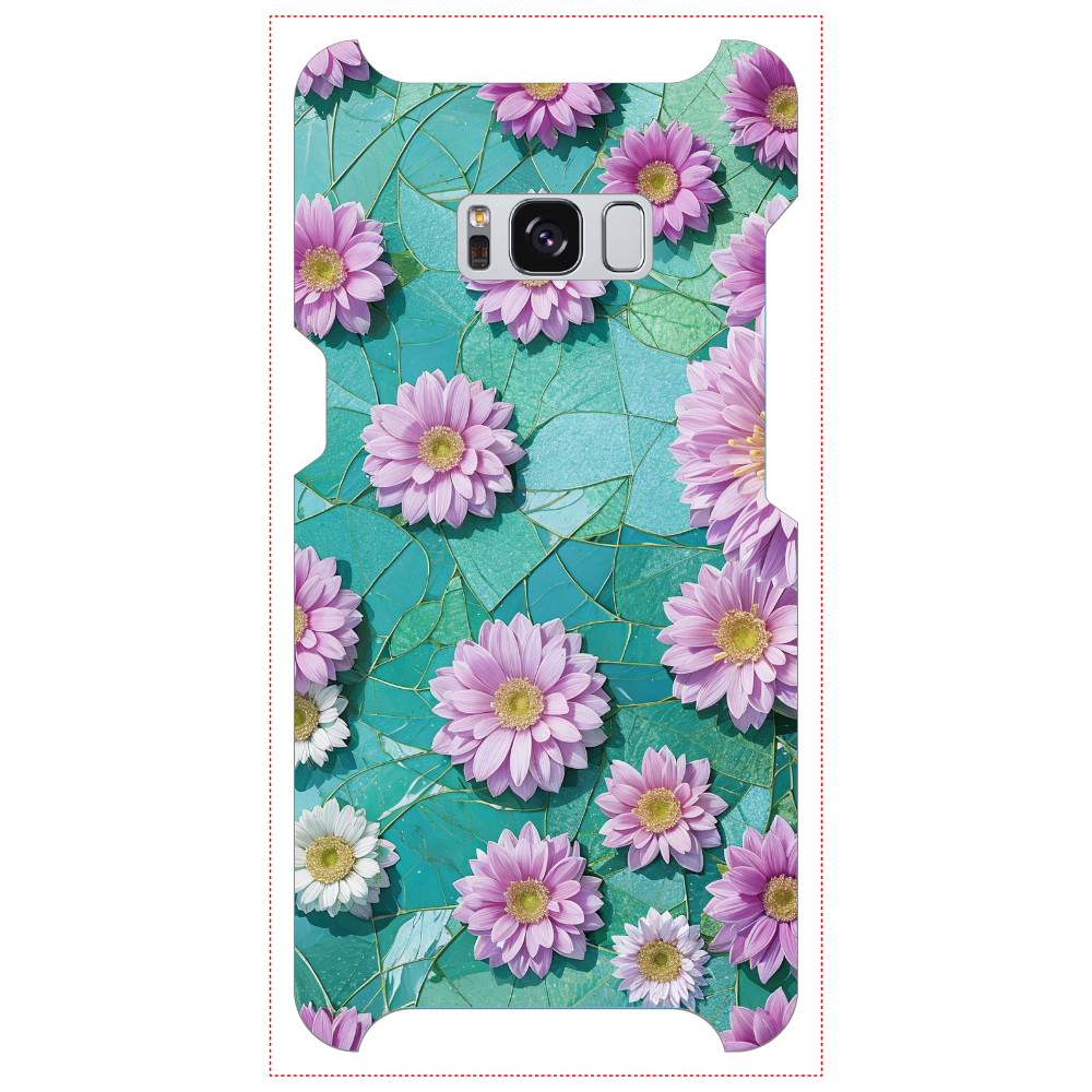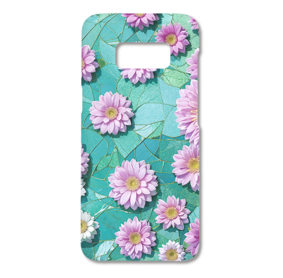 華やかなピンクのガーベラが、エメラルドグリーンのモザイクタイルの上に咲き誇る、美しいデザインのスマホケースです。