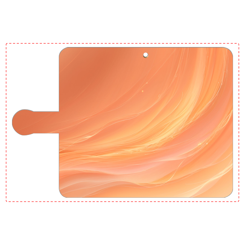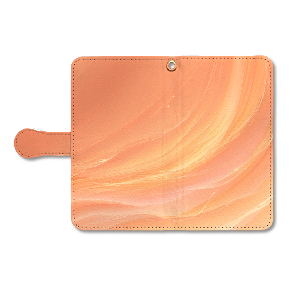 深い夕焼けが空一面に広がり、光の粒子が舞い上がるような、幻想的なスマホケースです。