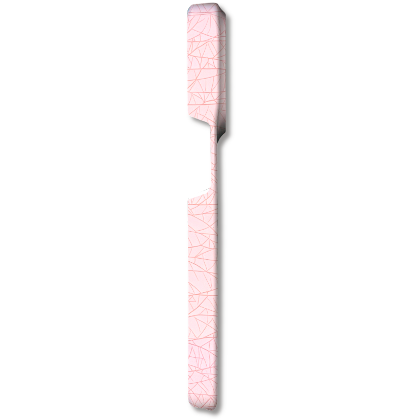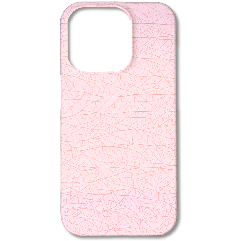 淡いパステルピンクの背景に、繊細な植物の葉脈のような模様が描かれた、フェミニンなスマホケースです。