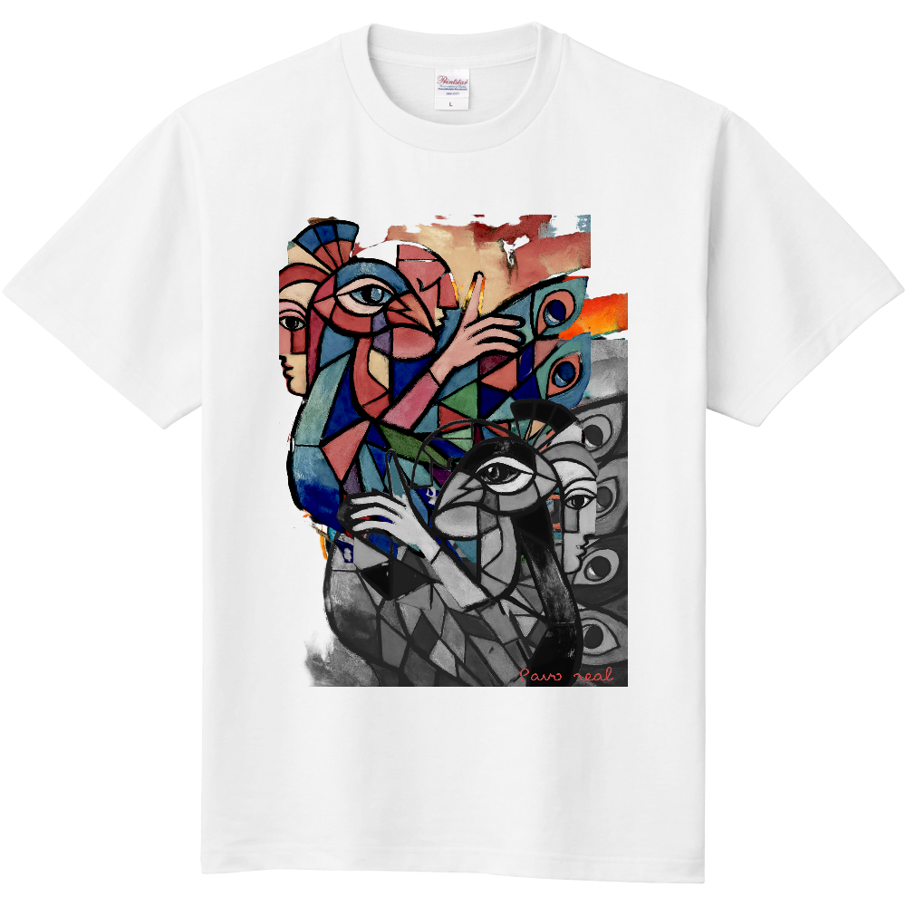 白Tシャツに描かれたキュビスム風の孔雀たちは、