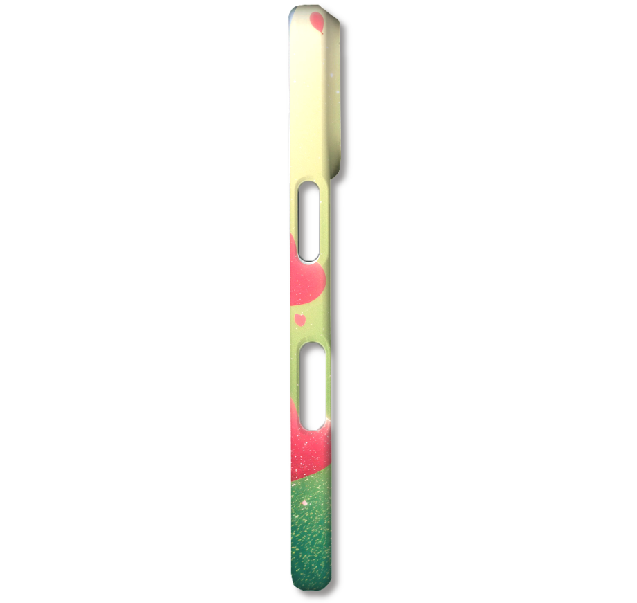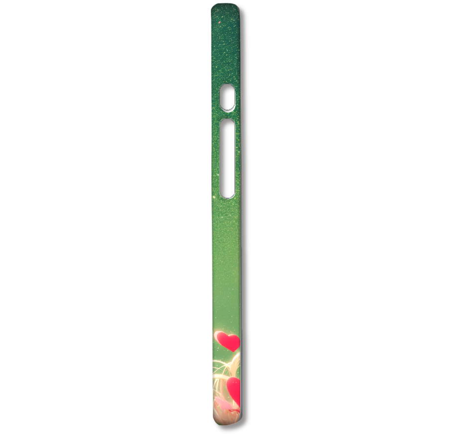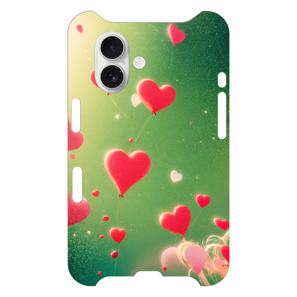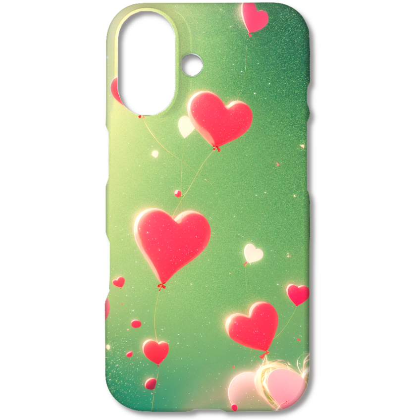 淡いグリーンに光が降り注ぐ幻想的な空に、たくさんのハートのバルーンが浮かぶスマホケースです。