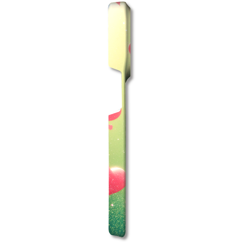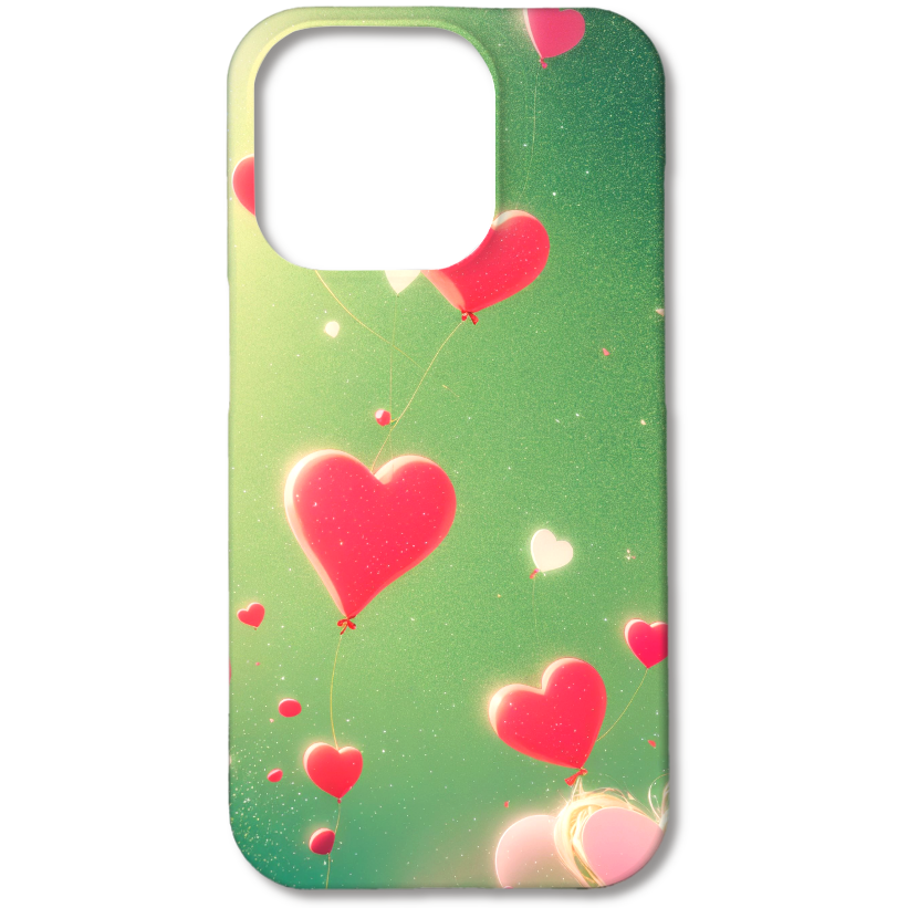 淡いグリーンに光が降り注ぐ幻想的な空に、たくさんのハートのバルーンが浮かぶスマホケースです。