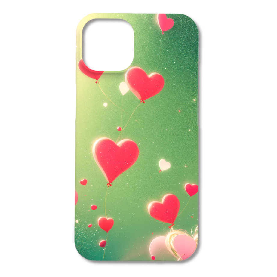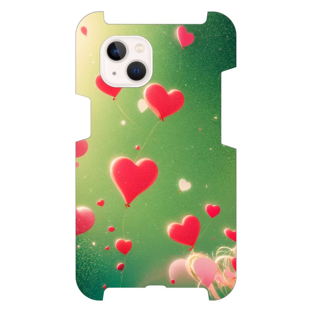 淡いグリーンに光が降り注ぐ幻想的な空に、たくさんのハートのバルーンが浮かぶスマホケースです。