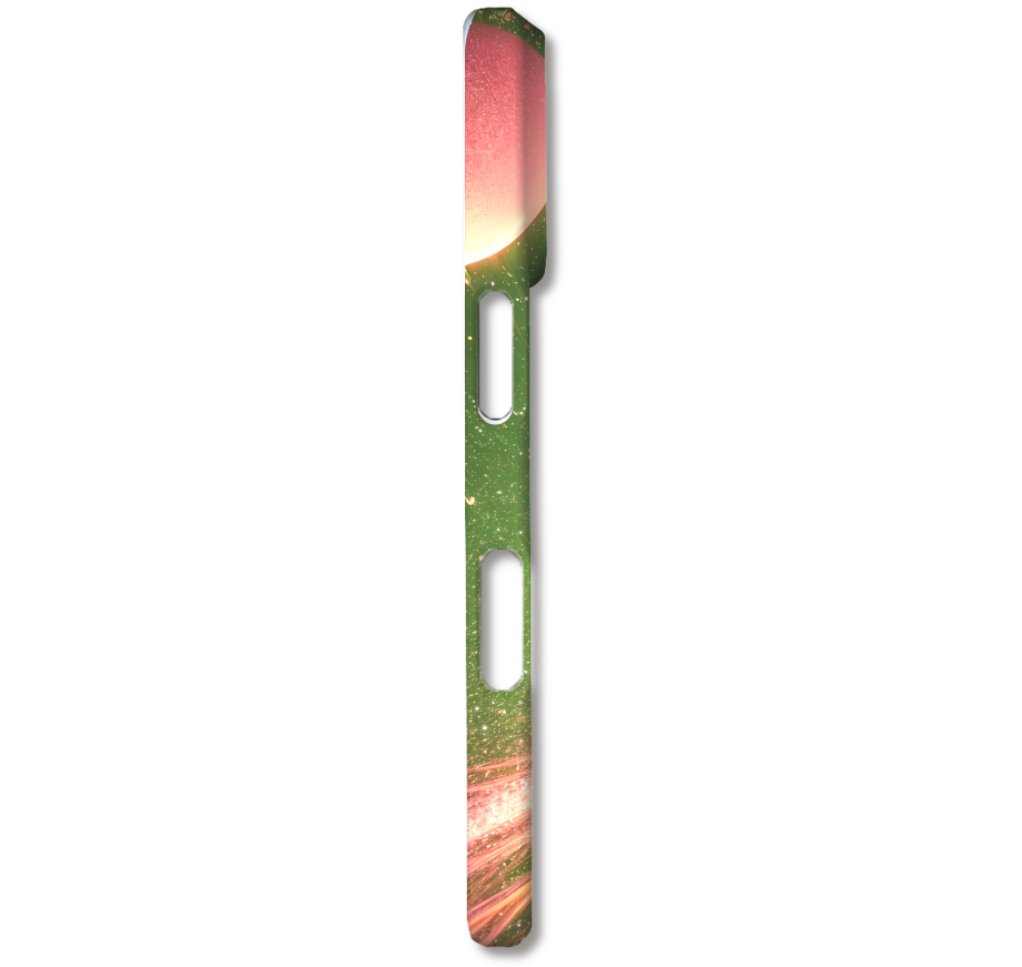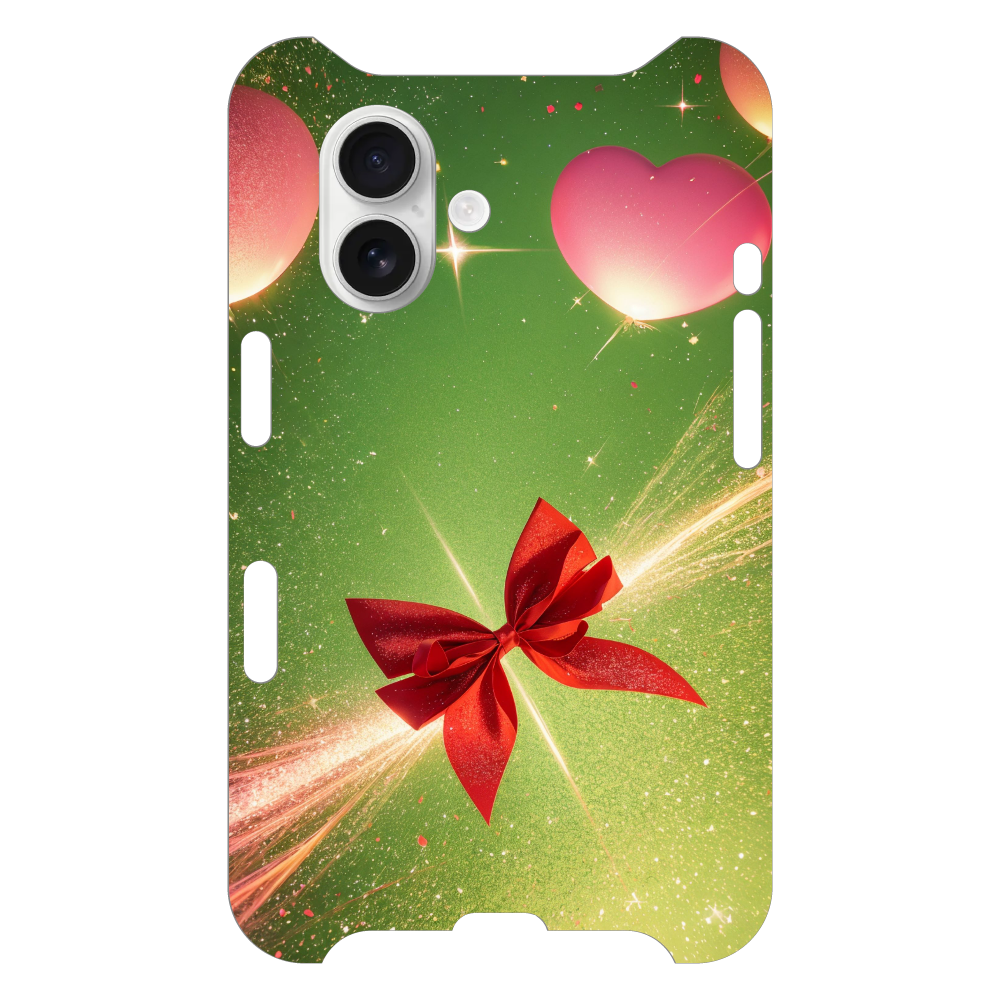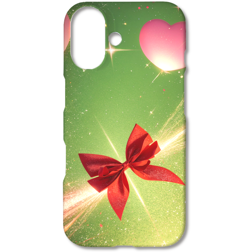 深みのあるグリーンを背景に、中央に光を放つ赤いリボンが印象的なスマホケースです。