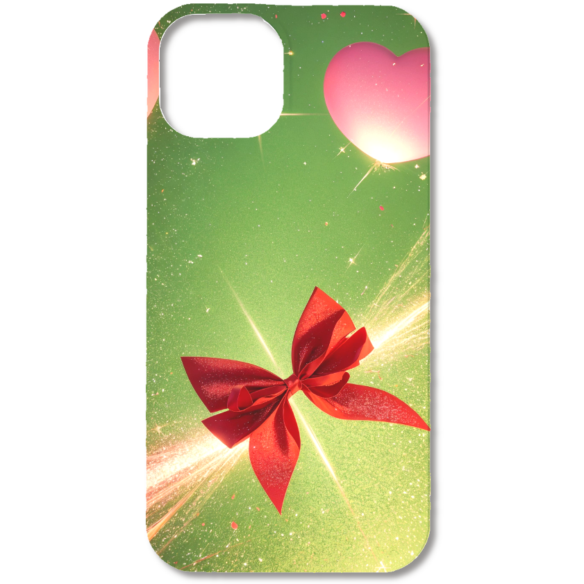 深みのあるグリーンを背景に、中央に光を放つ赤いリボンが印象的なスマホケースです。