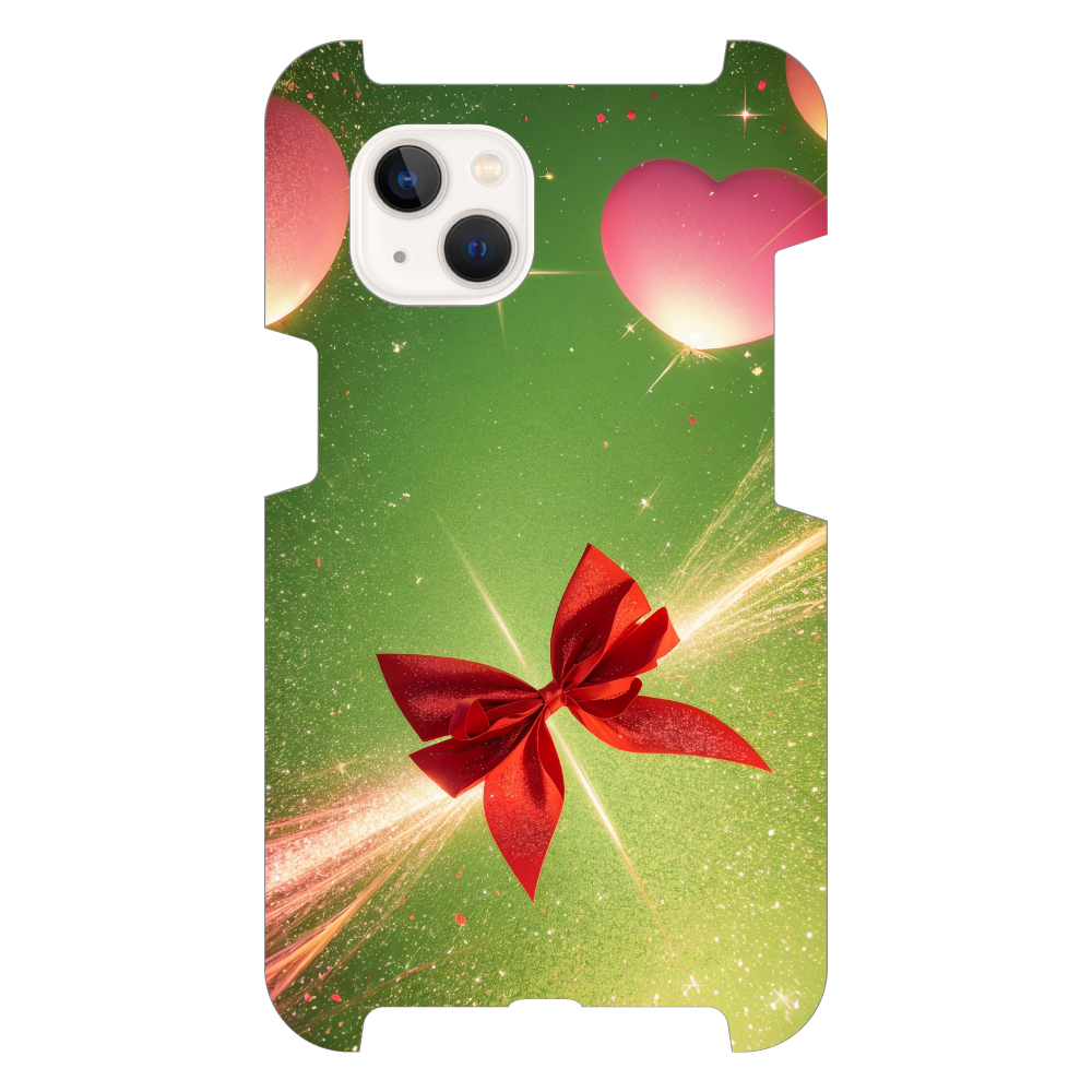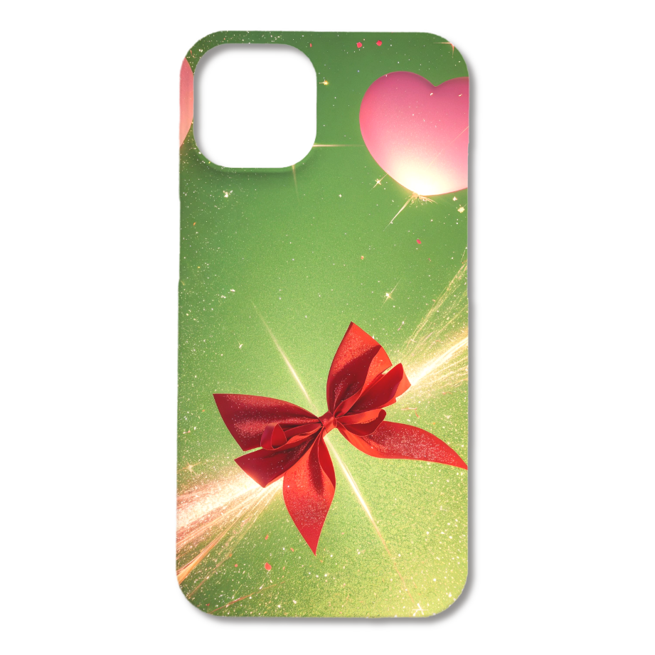 深みのあるグリーンを背景に、中央に光を放つ赤いリボンが印象的なスマホケースです。