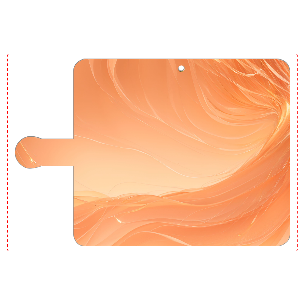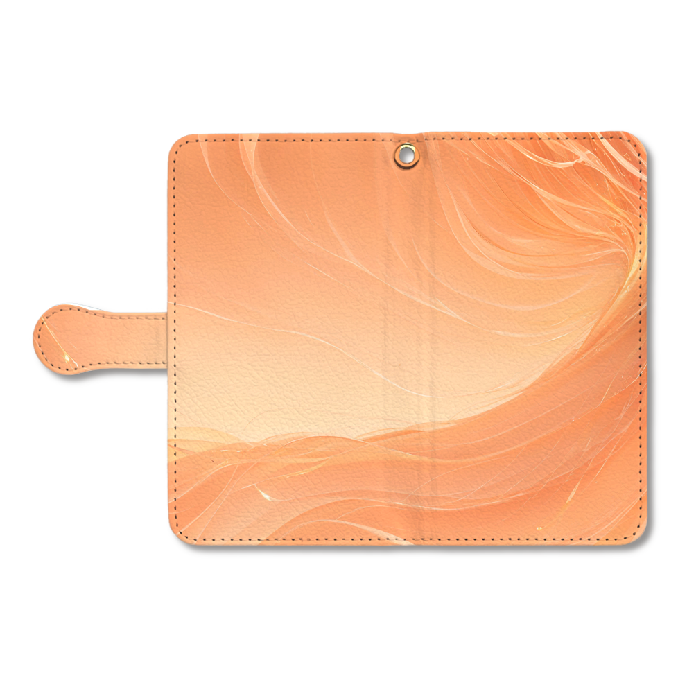 温かみのあるオレンジのグラデーションに、柔らかな光のウェーブが重なり合う、ラグジュアリーなスマホケースです。