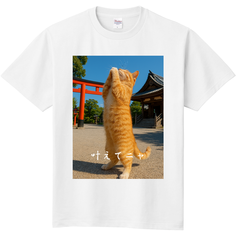 ペット(猫)の写真の背景透過し、名前を入れた画像を正面に、片袖に同じくセキセイインコの画像をプリントしてもらいました。