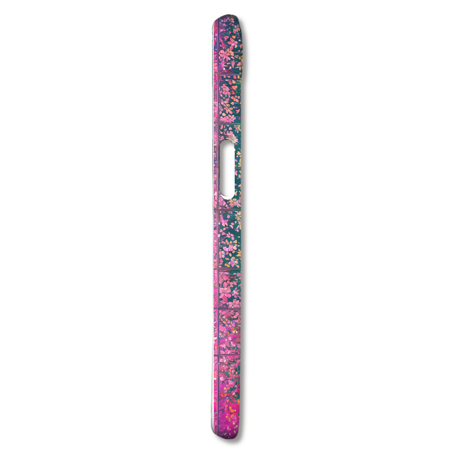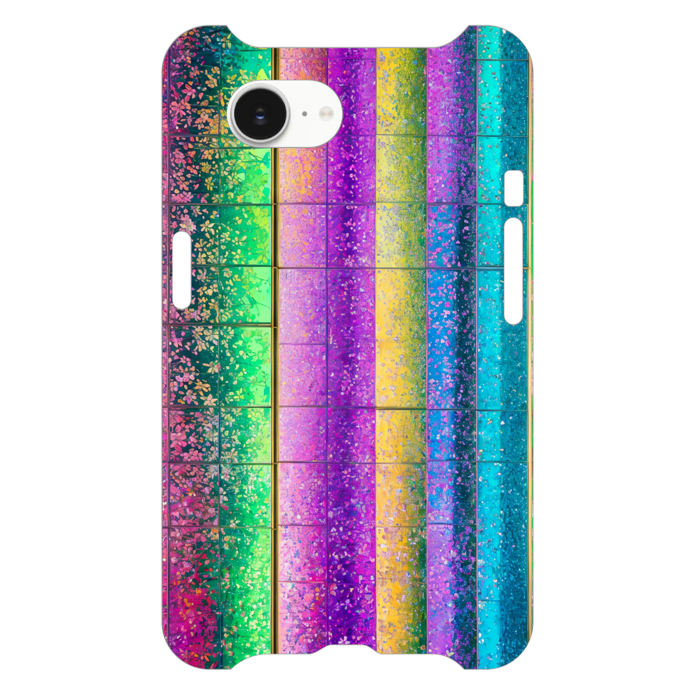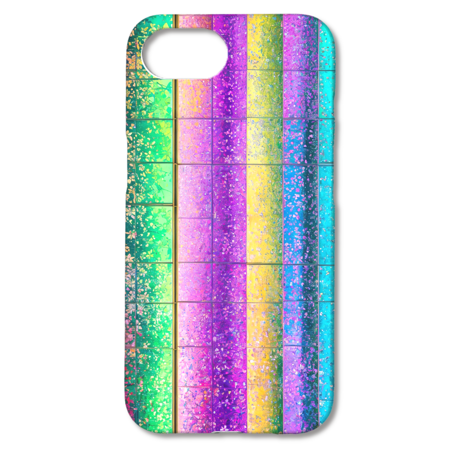 色とりどりのタイルに、繊細な花模様が舞い散るデザインのスマホケースです。