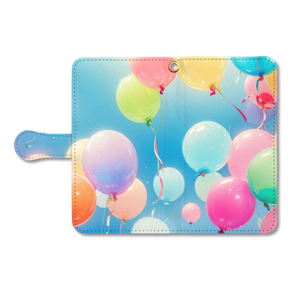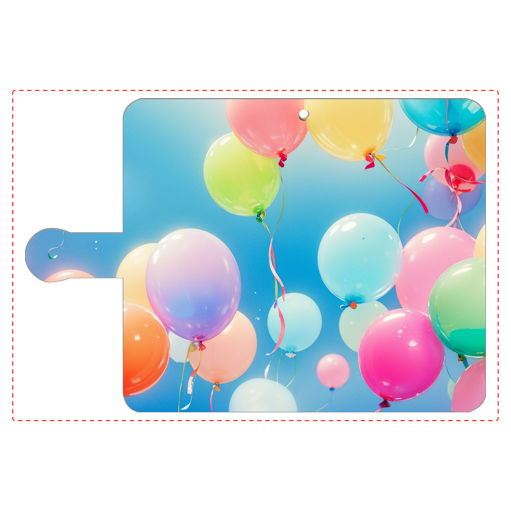 青い空に浮かぶ、色とりどりのパステルカラーの風船をモチーフにしたスマホケースです。