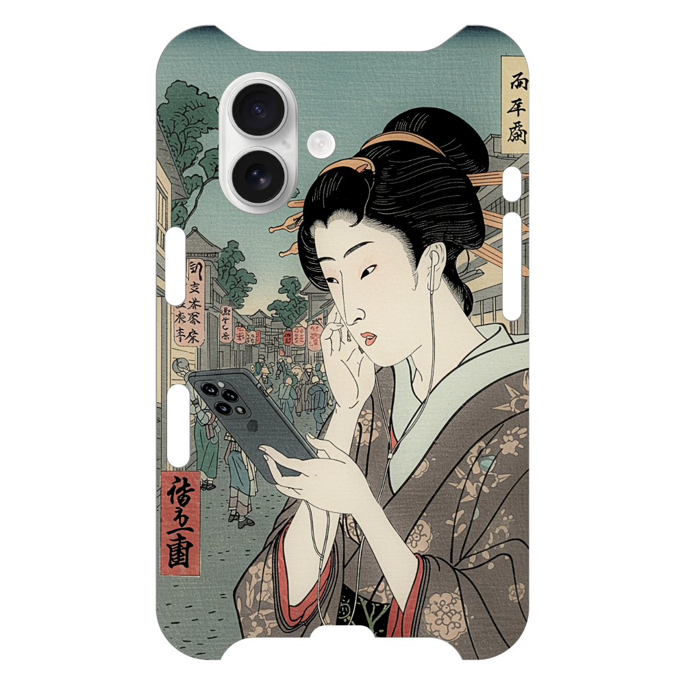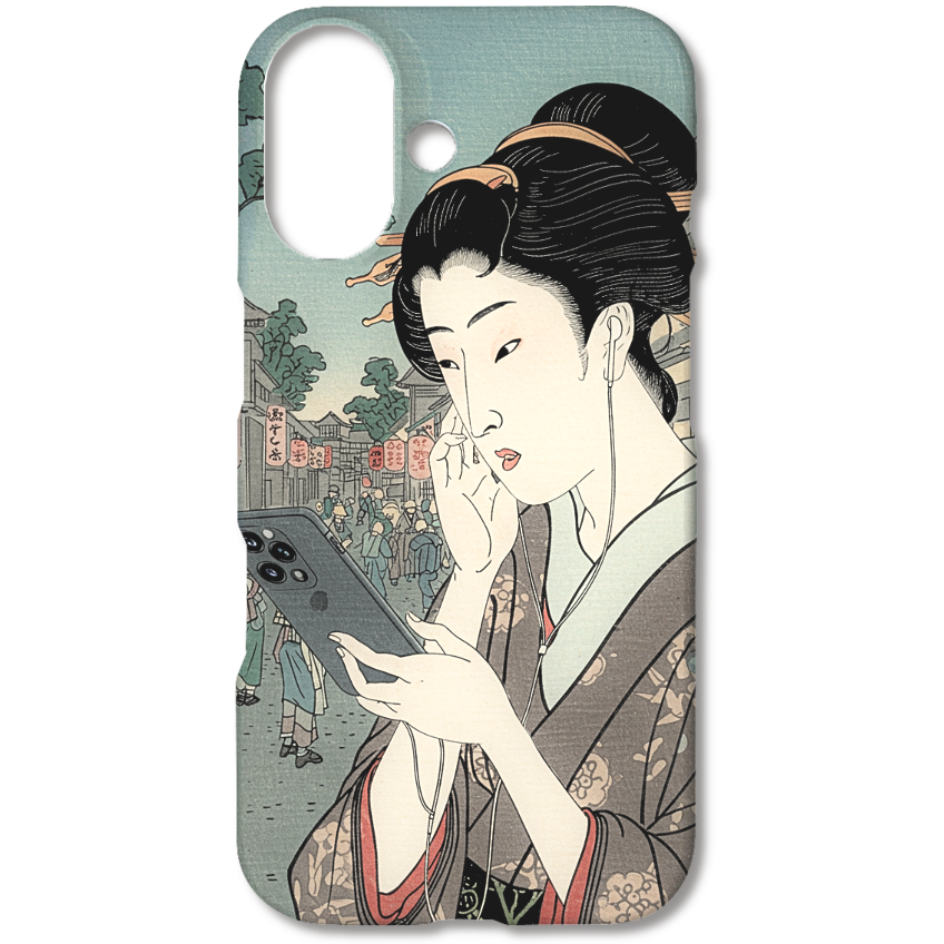 クセになるデザイン!江戸時代の美女も現代に生きていたら、きっとお気に入りのプレイリストでチルっていたはず!伝統とポップカルチャーが融合した、ちょっとシュールでクールなスマホケース。