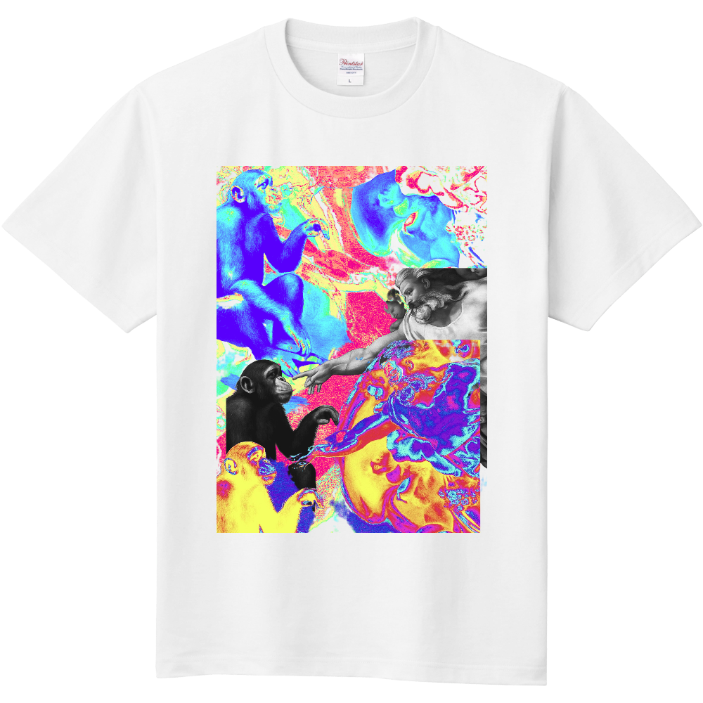 ミケランジェロの代表作《天地創造》をベースに、神と“チンパンジー”が指を交わす瞬間を描いた再構築アート。