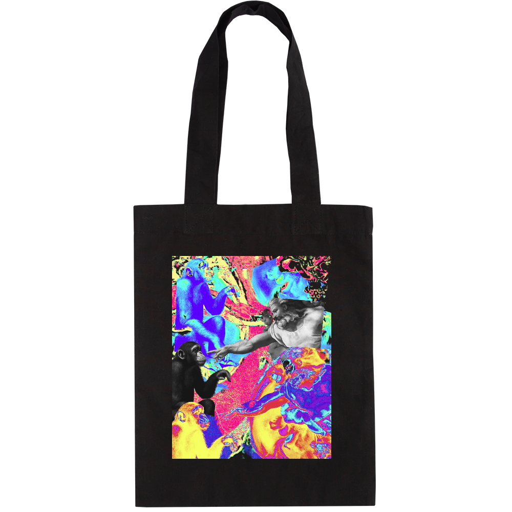 ミケランジェロの代表作《天地創造》をベースに、神と“チンパンジー”が指を交わす瞬間を描いた再構築アート。