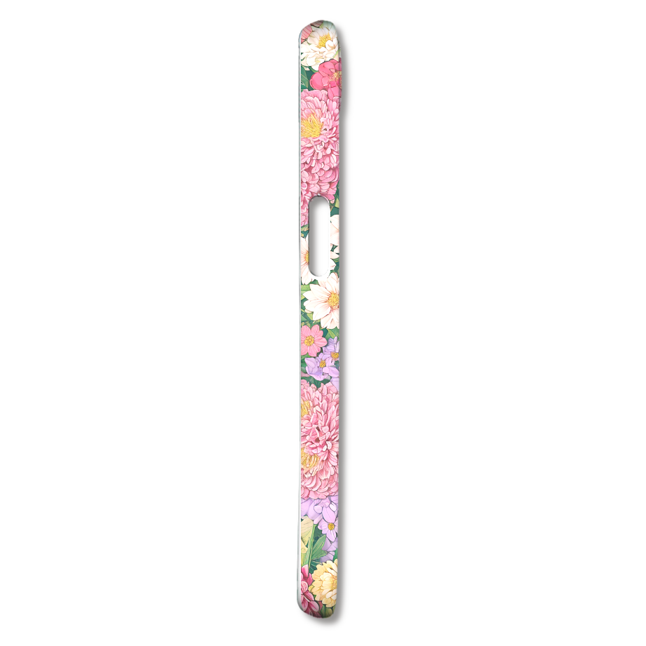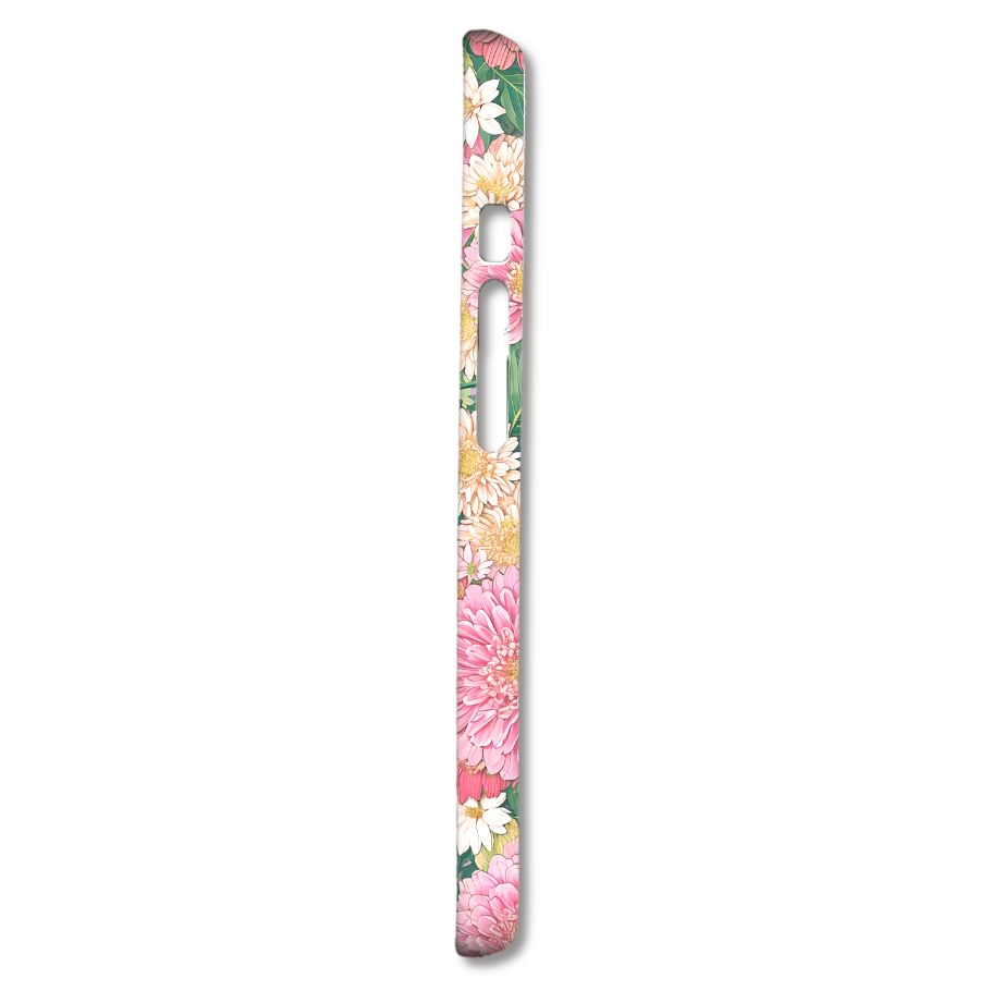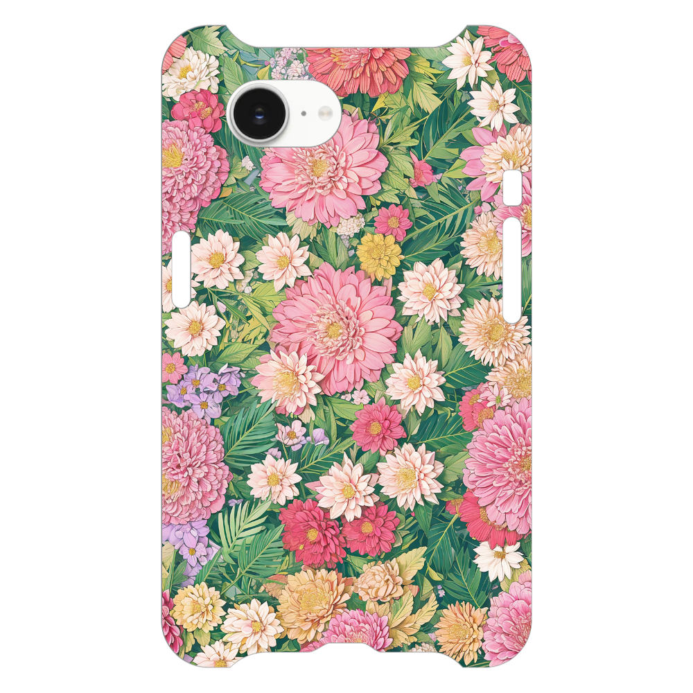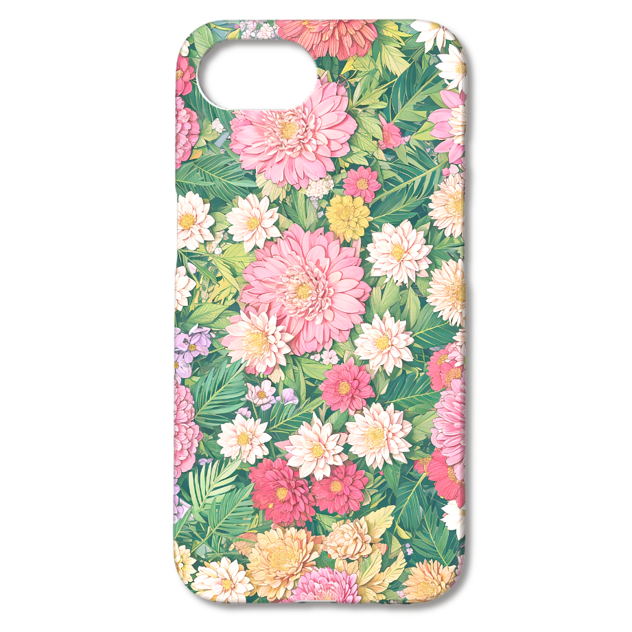 ピンク、イエロー、ホワイトの華やかな花々が、画面いっぱいに咲き誇るスマホケースです。