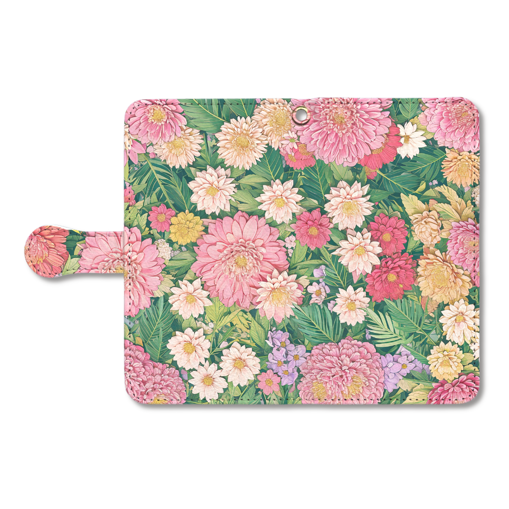 ピンク、イエロー、ホワイトの華やかな花々が、画面いっぱいに咲き誇るスマホケースです。