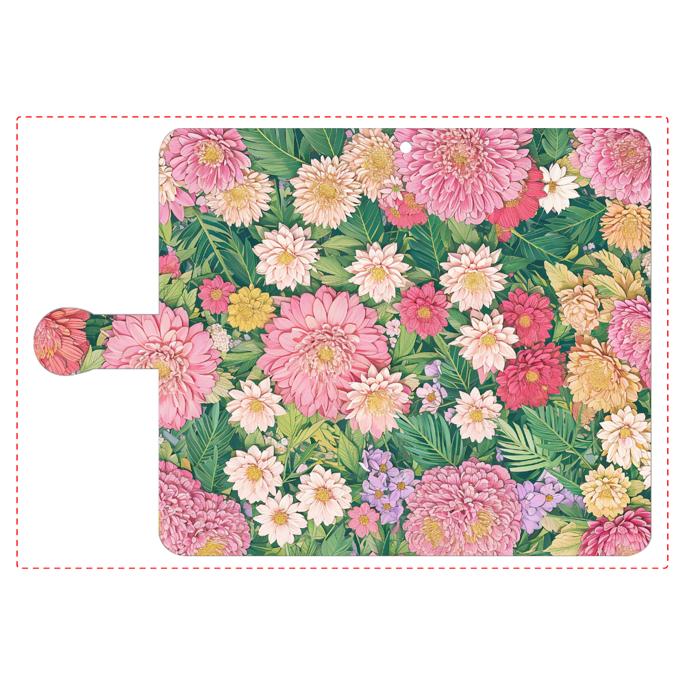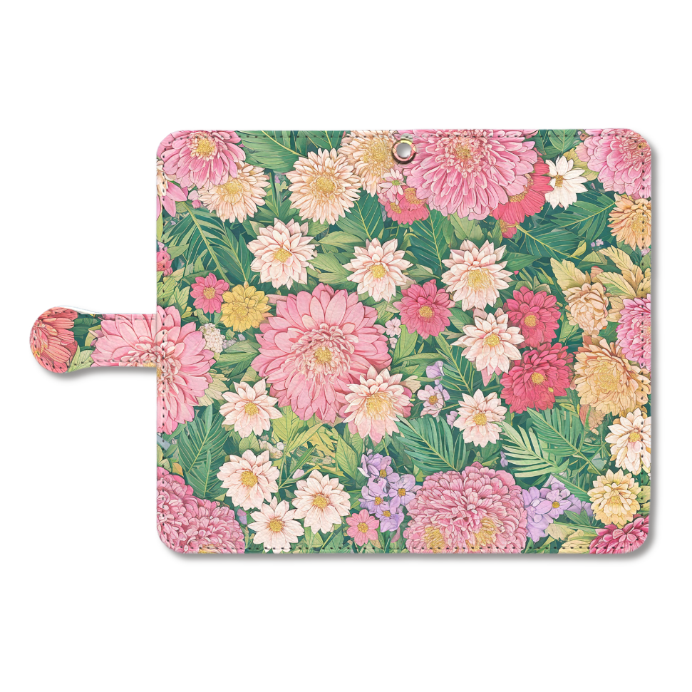 ピンク、イエロー、ホワイトの華やかな花々が、画面いっぱいに咲き誇るスマホケースです。