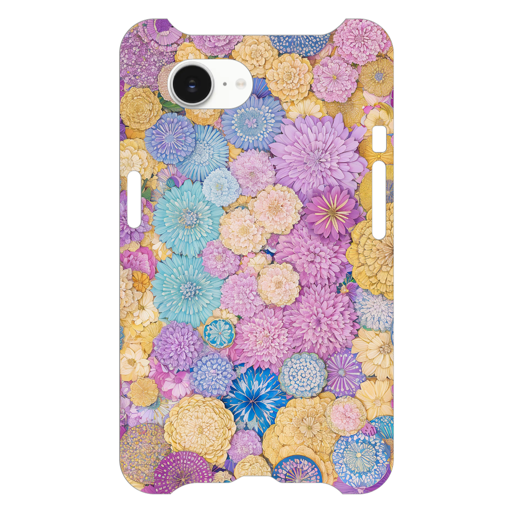 色とりどりの花々を敷き詰めた、まるで万華鏡のようなデザインです。イエロー、パープル、ブルー、ピンクなど、様々なカラーのダリアやマムが密集し、見る角度によって表情を変える鮮やかさが魅力。