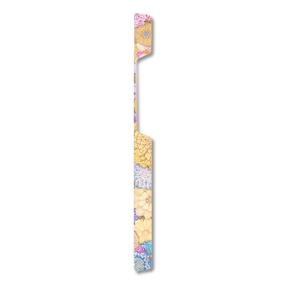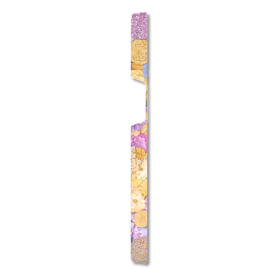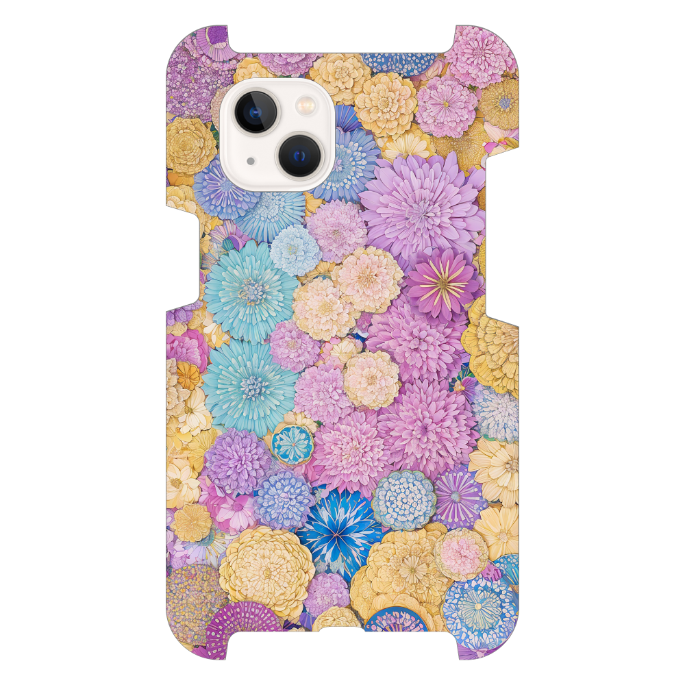 色とりどりの花々を敷き詰めた、まるで万華鏡のようなデザインです。イエロー、パープル、ブルー、ピンクなど、様々なカラーのダリアやマムが密集し、見る角度によって表情を変える鮮やかさが魅力。