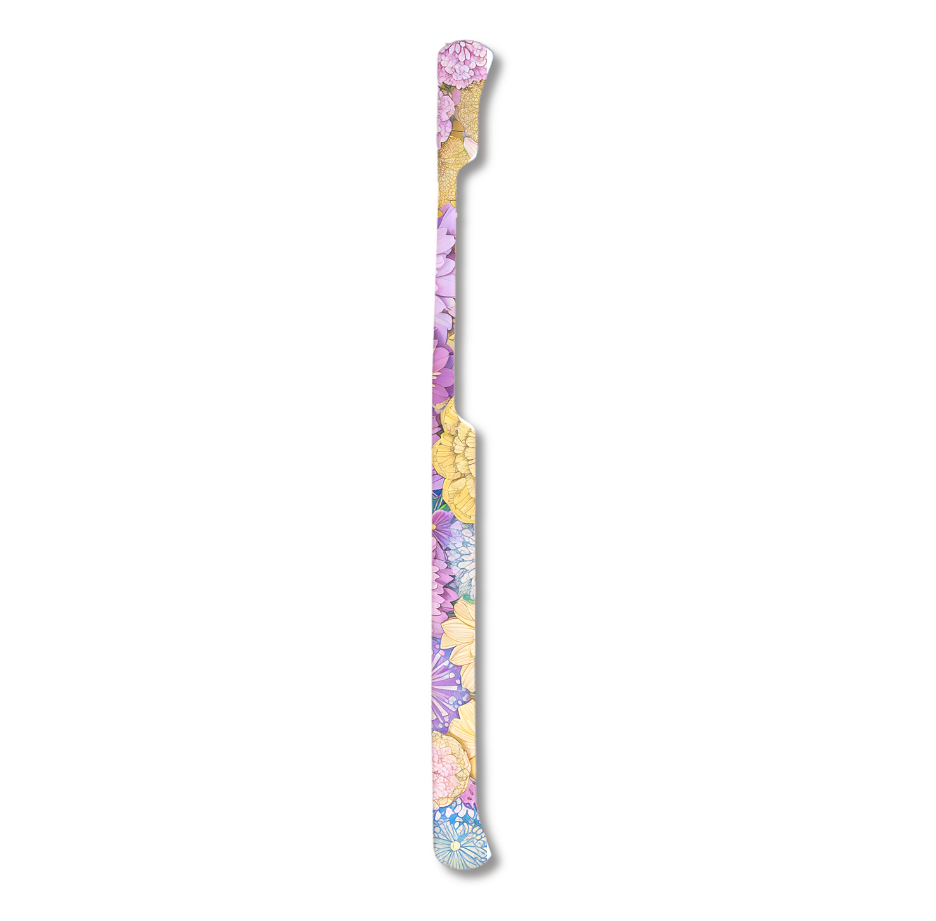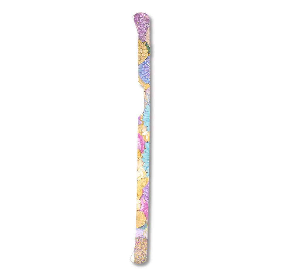 色とりどりの花々を敷き詰めた、まるで万華鏡のようなデザインです。イエロー、パープル、ブルー、ピンクなど、様々なカラーのダリアやマムが密集し、見る角度によって表情を変える鮮やかさが魅力。