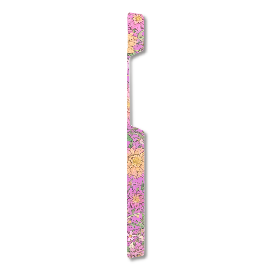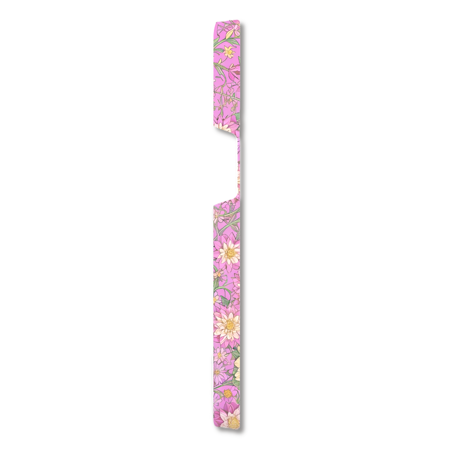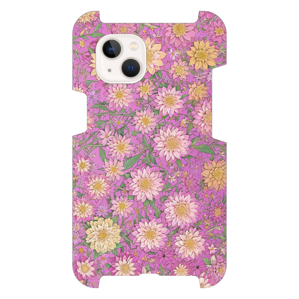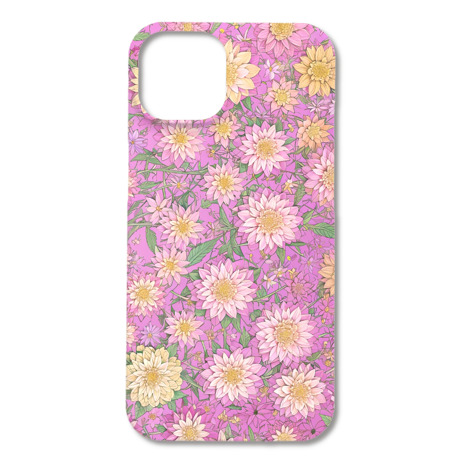 淡いピンクとパープルの背景に、繊細なタッチで描かれた花々が咲き誇る、ロマンチックなデザインです。ダリアや菊のような可憐な花が画面いっぱいに広がり、優しい色合いが気分を明るくしてくれます。