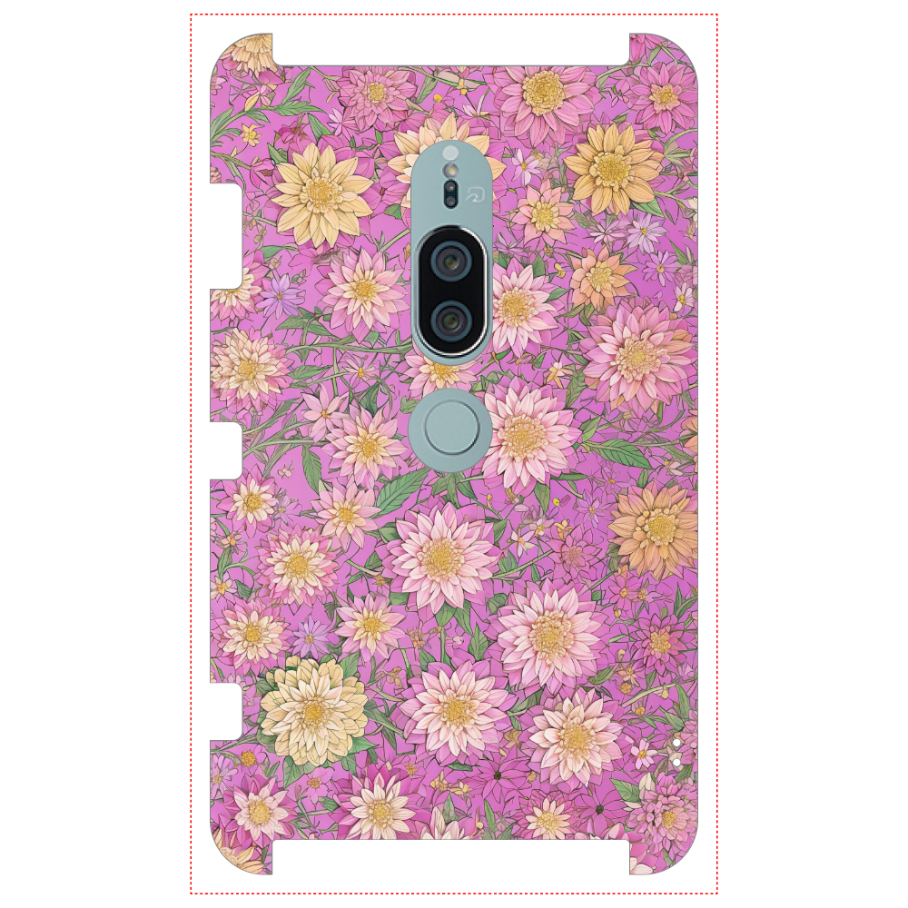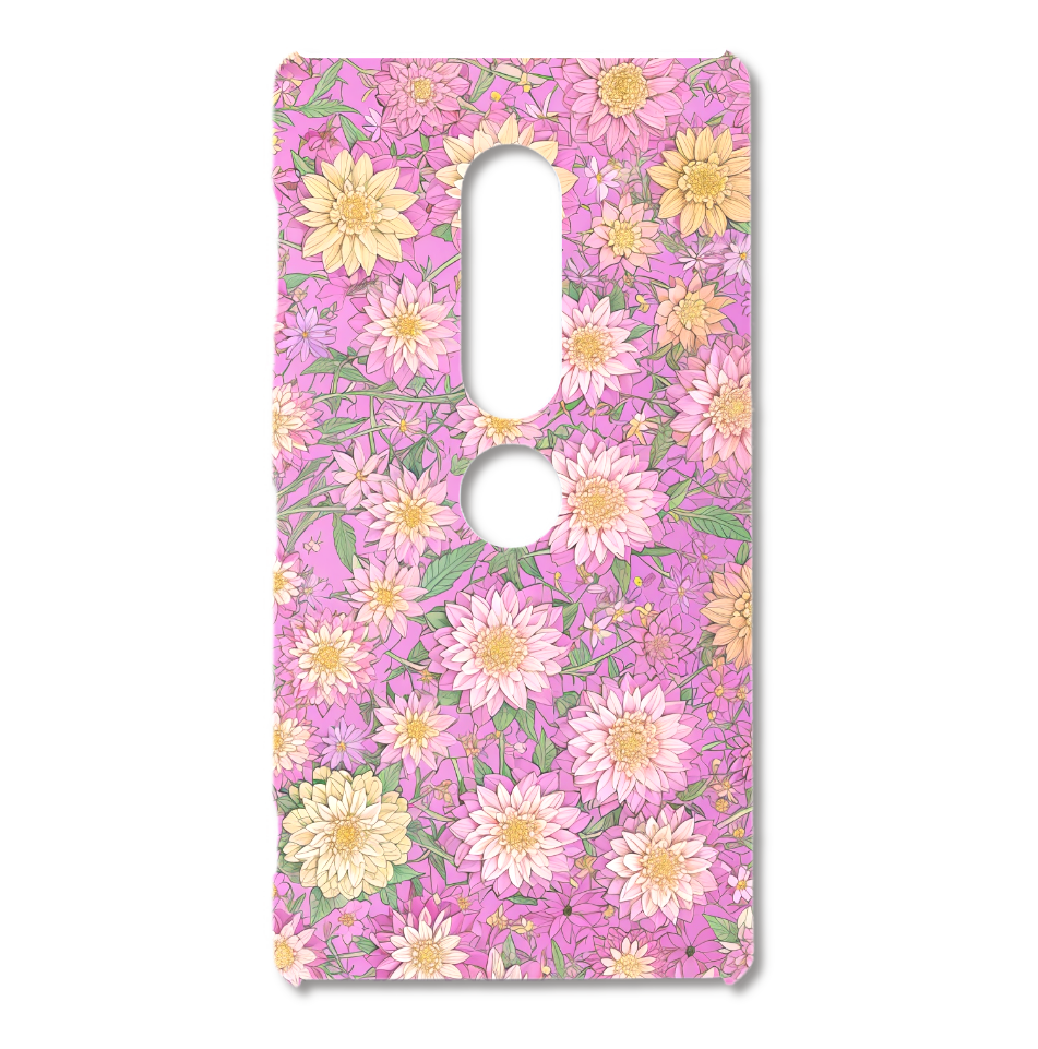 淡いピンクとパープルの背景に、繊細なタッチで描かれた花々が咲き誇る、ロマンチックなデザインです。ダリアや菊のような可憐な花が画面いっぱいに広がり、優しい色合いが気分を明るくしてくれます。