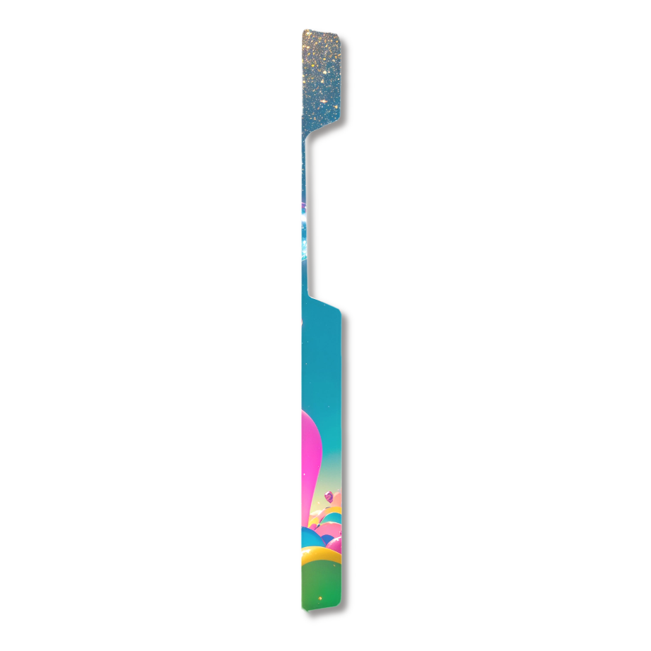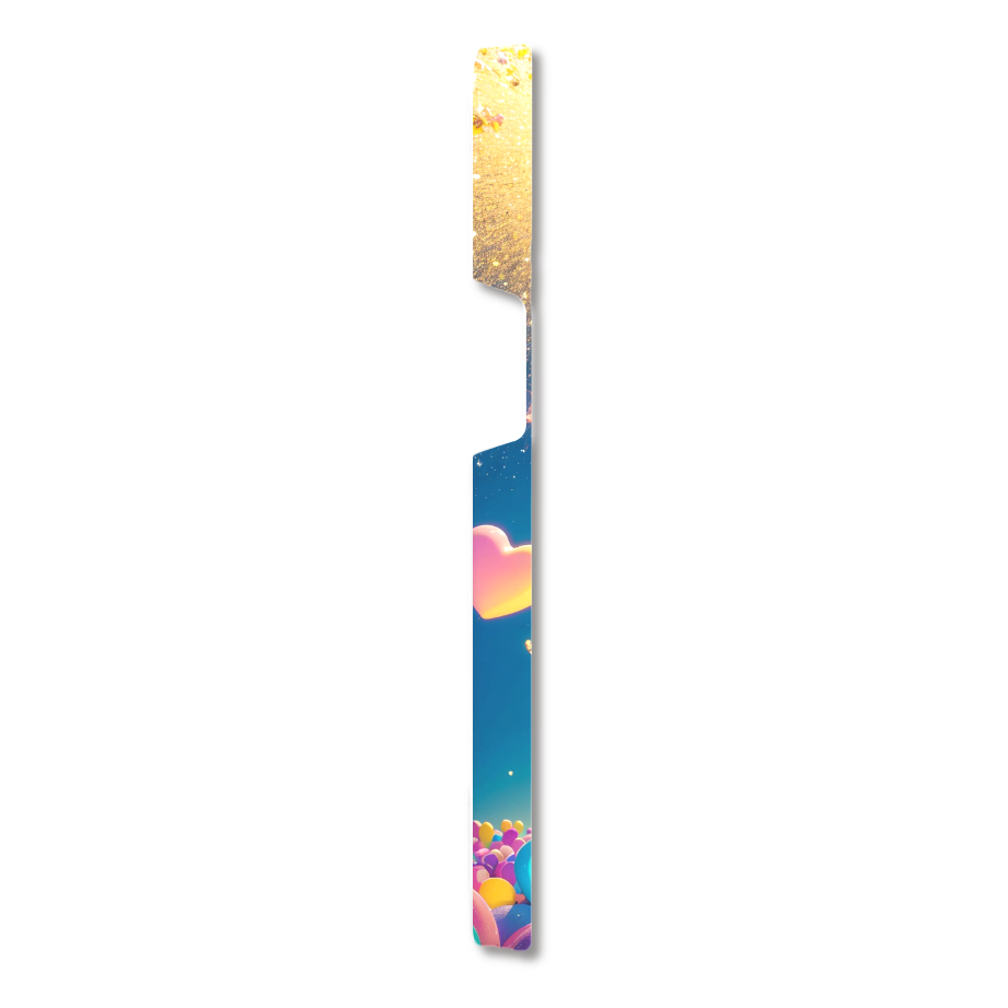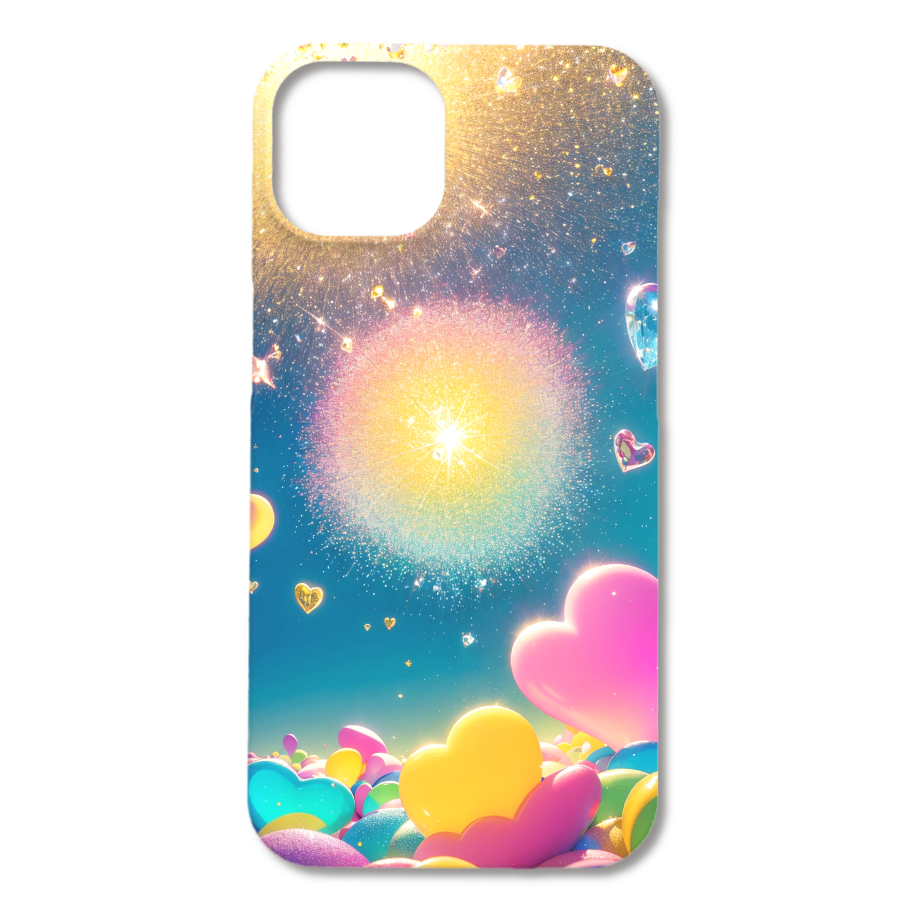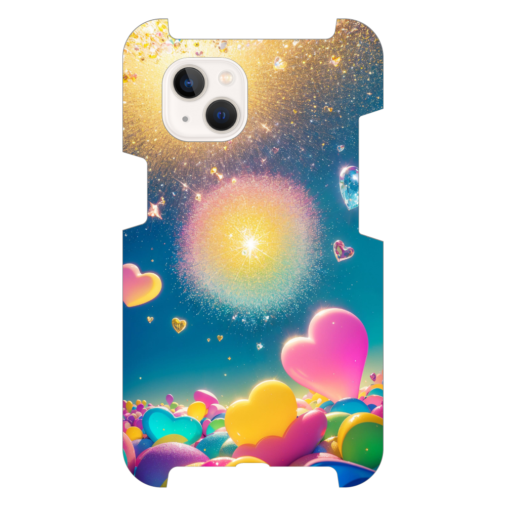 まるで愛と幸せが宇宙全体に溢れ出したような、見ているだけで心が躍るスマホケースです。画面下部には虹色のカラフルなハートやボールがポップに散りばめられ、宇宙空間には様々な色とサイズのハートたちが浮遊しています。