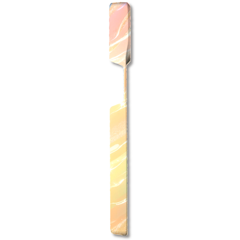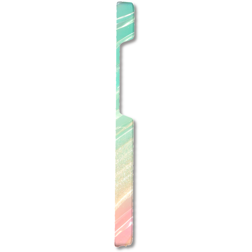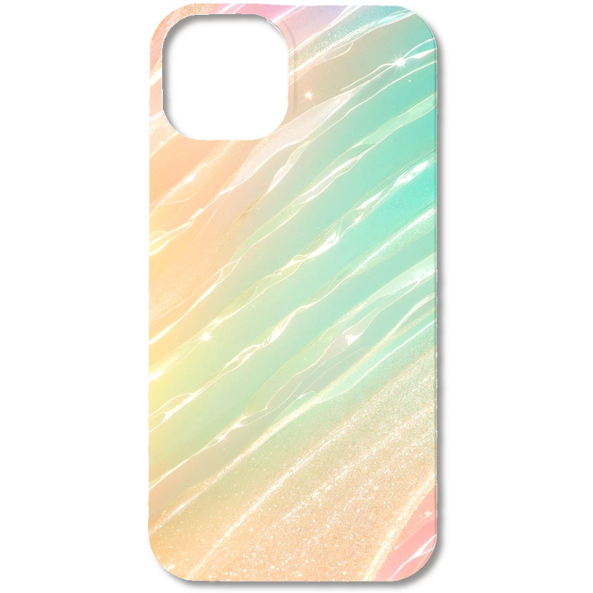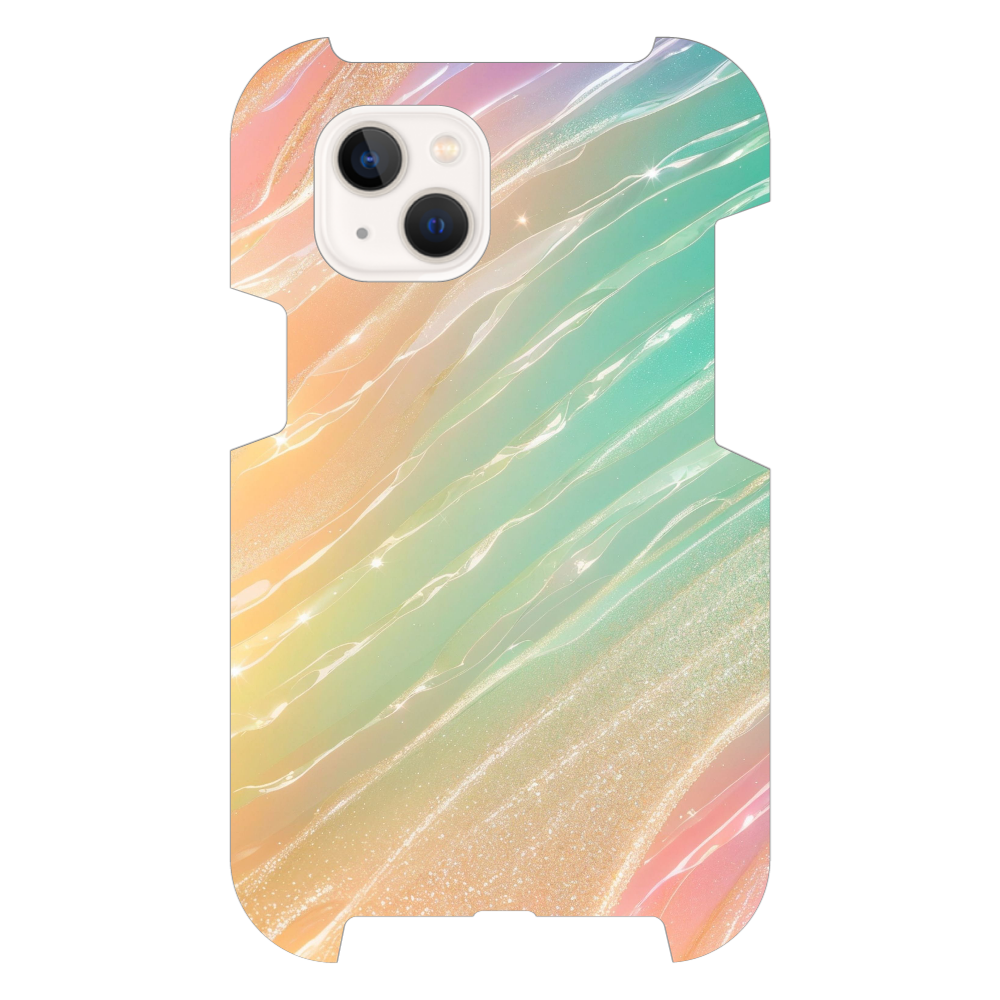 ピンク、オレンジ、イエロー、ミント、パープルの柔らかなグラデーションが、光の流れのような動的な美しさを表現。キラキラとした粒子が散りばめられ、まるでオーロラや宇宙の光を閉じ込めたような幻想的なデザインです。