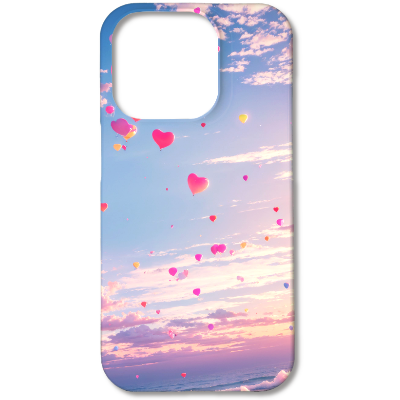 まるで愛のメッセージが空いっぱいに広がるような、ロマンチックなスマホケースです。夕焼けに染まる空と海を背景に、たくさんのハートが浮かびます。持っているだけで心が温かくなるような、特別なアイテムです。