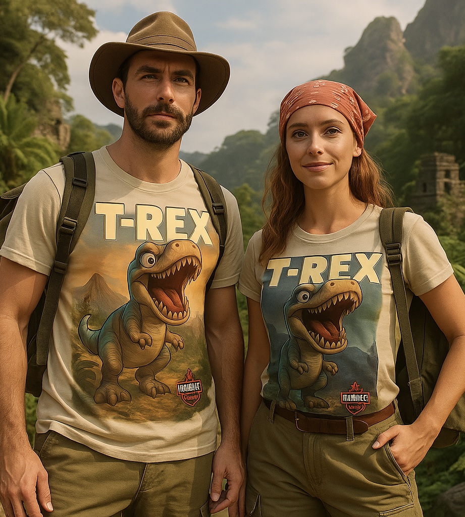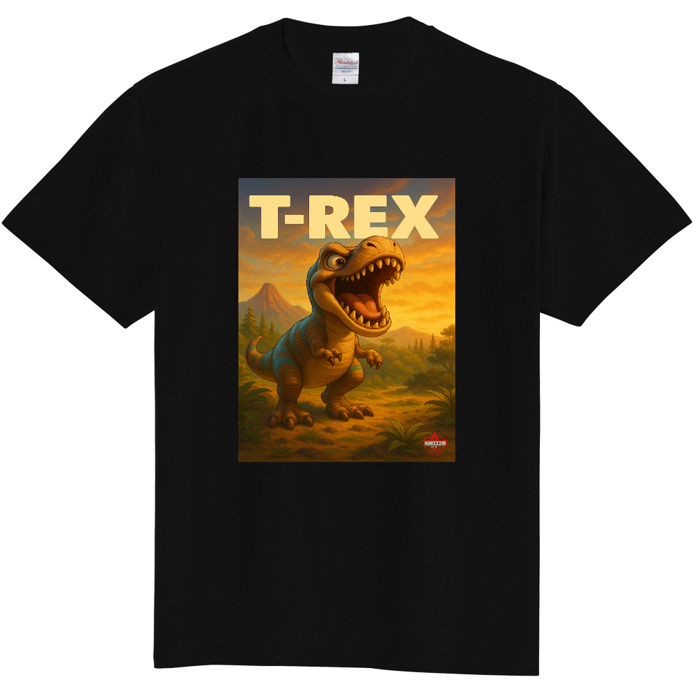 中心にポップでコミカルな T-REXキャラクター を大きく配置。大きな口と丸い目で、迫力と可愛らしさを両立。上部に大きな「T-REX」のテキスト、下部に HIRO3319 SPIRIT / ENERGY ロゴを統一的に配置。
