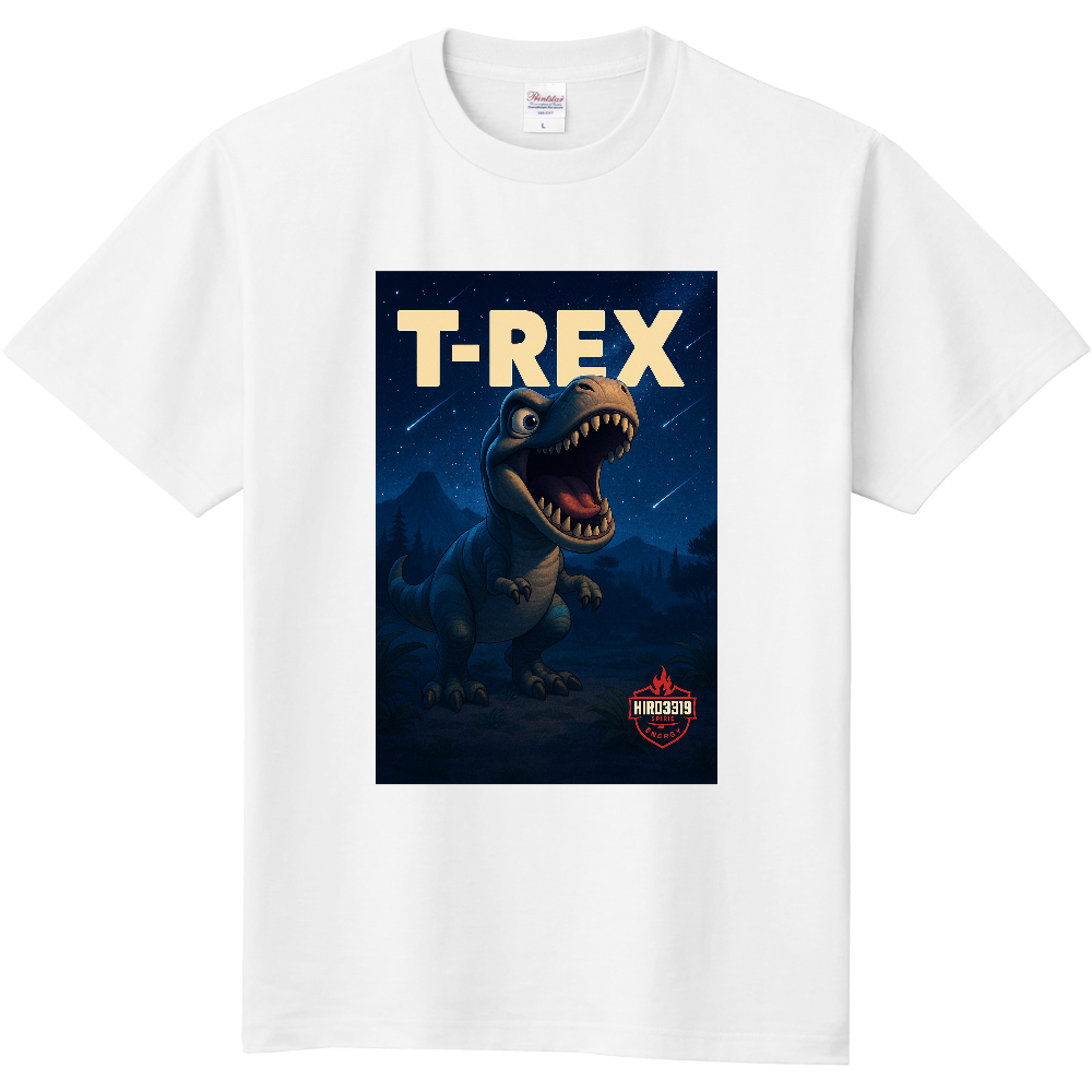 中心にポップでコミカルな T-REXキャラクター を大きく配置。大きな口と丸い目で、迫力と可愛らしさを両立。上部に大きな「T-REX」のテキスト、下部に HIRO3319 SPIRIT / ENERGY ロゴを統一的に配置。