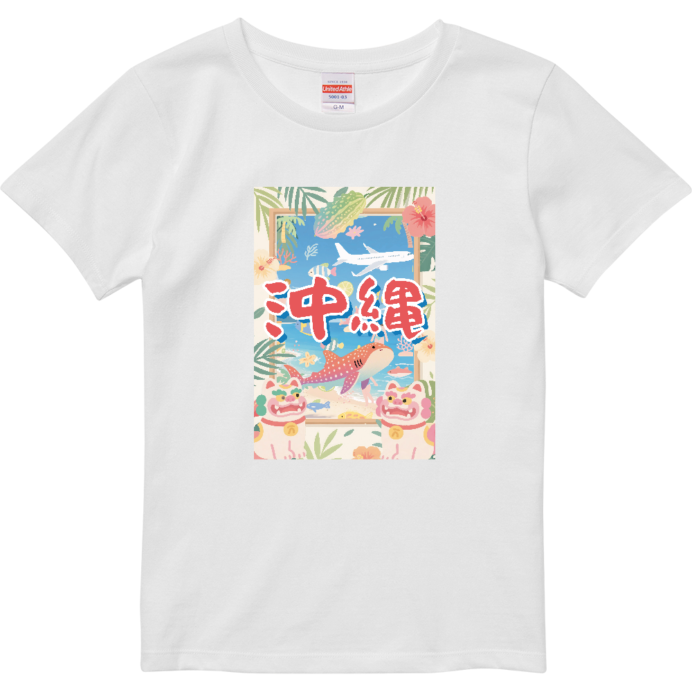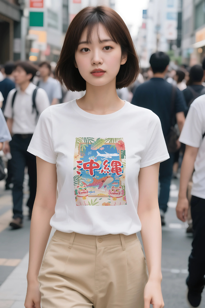 美しいエメラルドグリーンの海、色鮮やかな生き物たち、そして独特の文化が息づく沖縄の魅力がギュッと詰まったTシャツが登場!この「沖縄」Tシャツは、シーサー、ジンベエザメ、飛行機、ゴーヤ、ハイビスカスなど、沖縄を象徴するモチーフがポップで可愛らしいイラストで描かれています。沖縄の青い海と空を背景に、楽しかった旅の思い出や、憧れの南国リゾートの気分をいつでも感じられる一枚です。